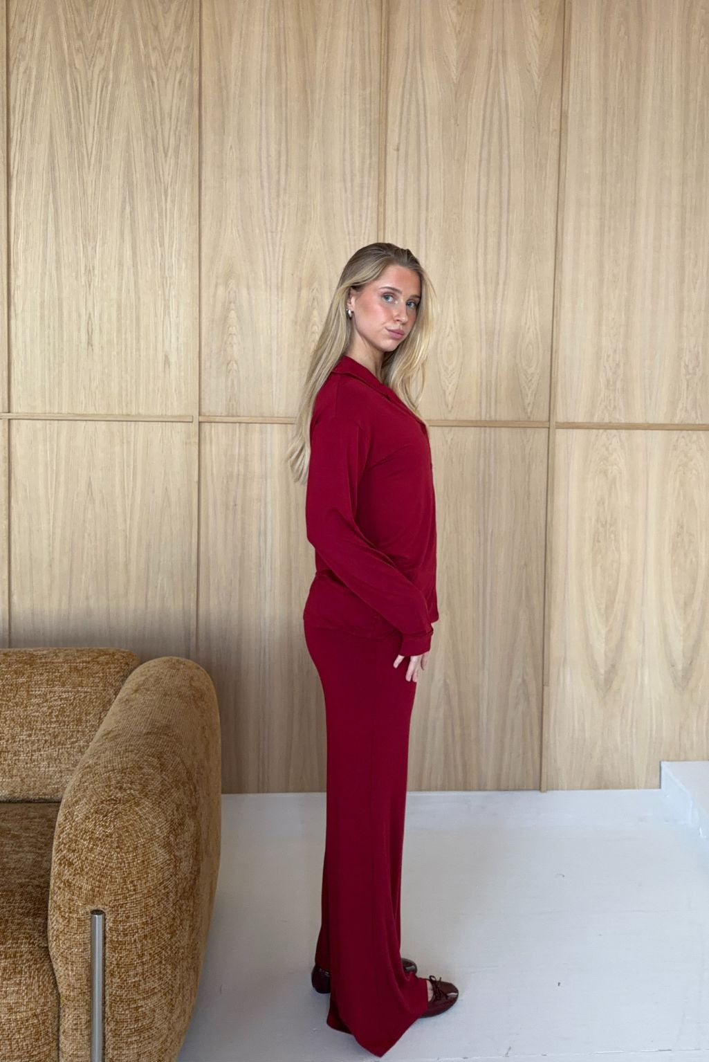 FITBERRY® HOLIDAY PYJAMAS PANTS. The softest pyjamas pants in a rich burgundy shade featuring a wide flared leg, hidden elastic drawstring waist and deep pockets. Crafted from a silky, breathable modal rib with an oversized fit and gentle stretch. This set is perfect for slow winter mornings and late nights at home.