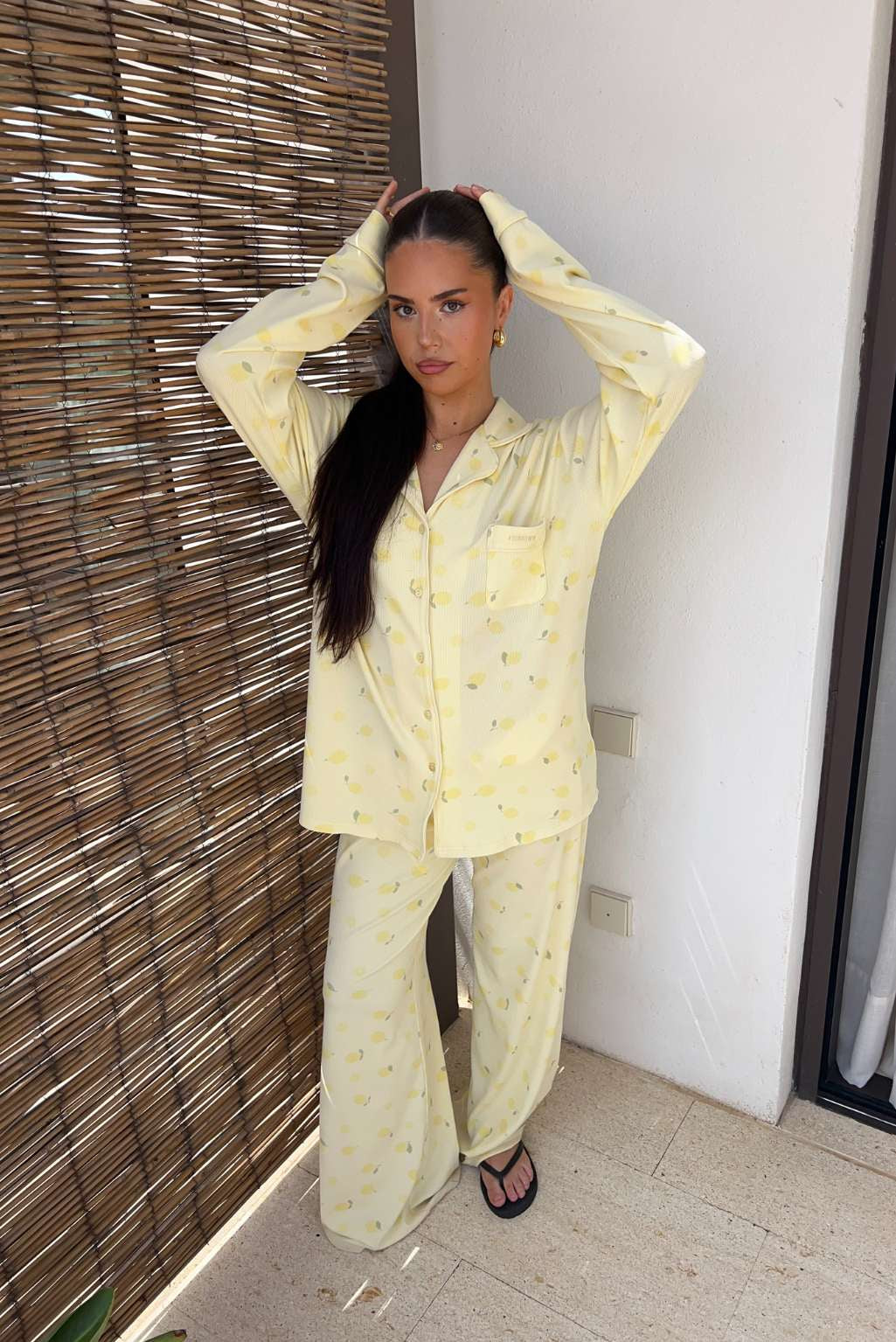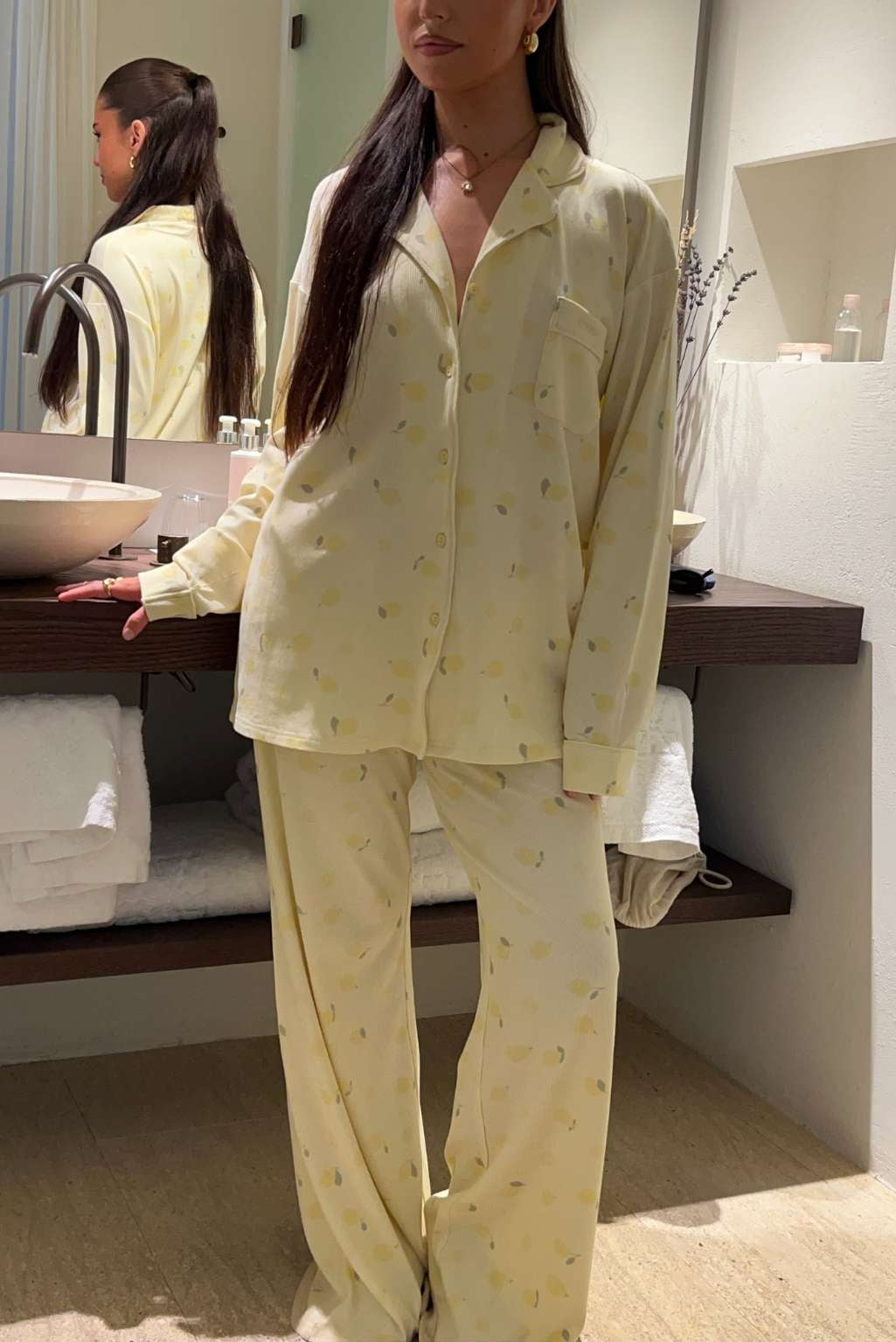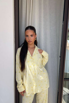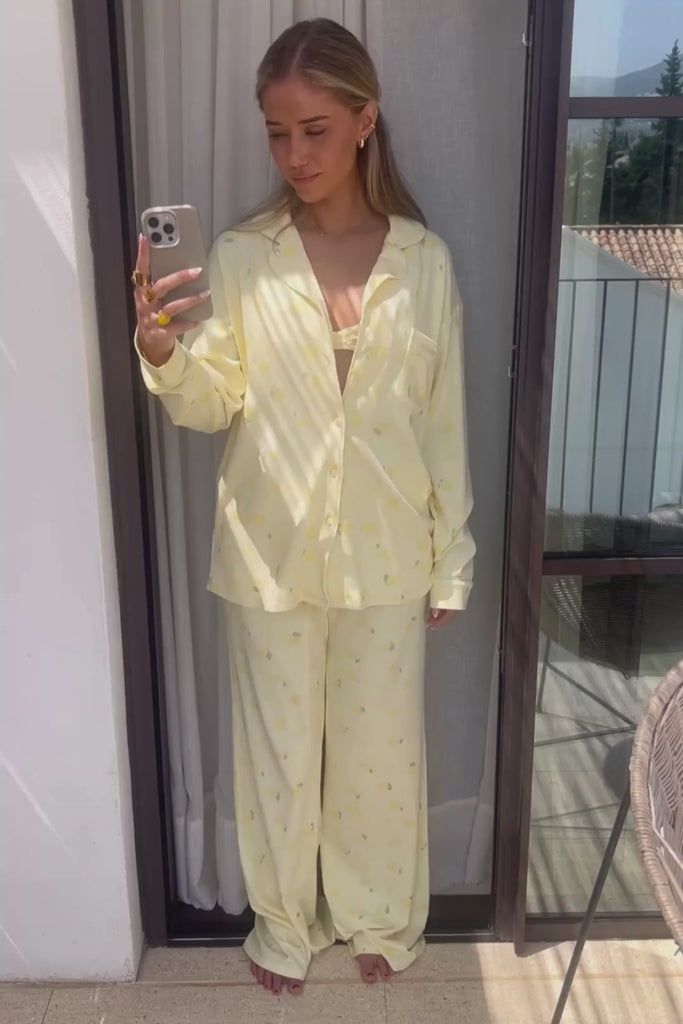 FITBERRY® CITRUS BLOOM PYJAMAS PANTS. The softest butter yellow pyjamas pants featuring a delicate all-over citrus lemon print, wide leg, hidden elastic drawstring waist and deep pockets. Crafted from a silky, breathable modal rib with an oversized fit and gentle stretch. This set is perfect for slow mornings and golden hour evenings.