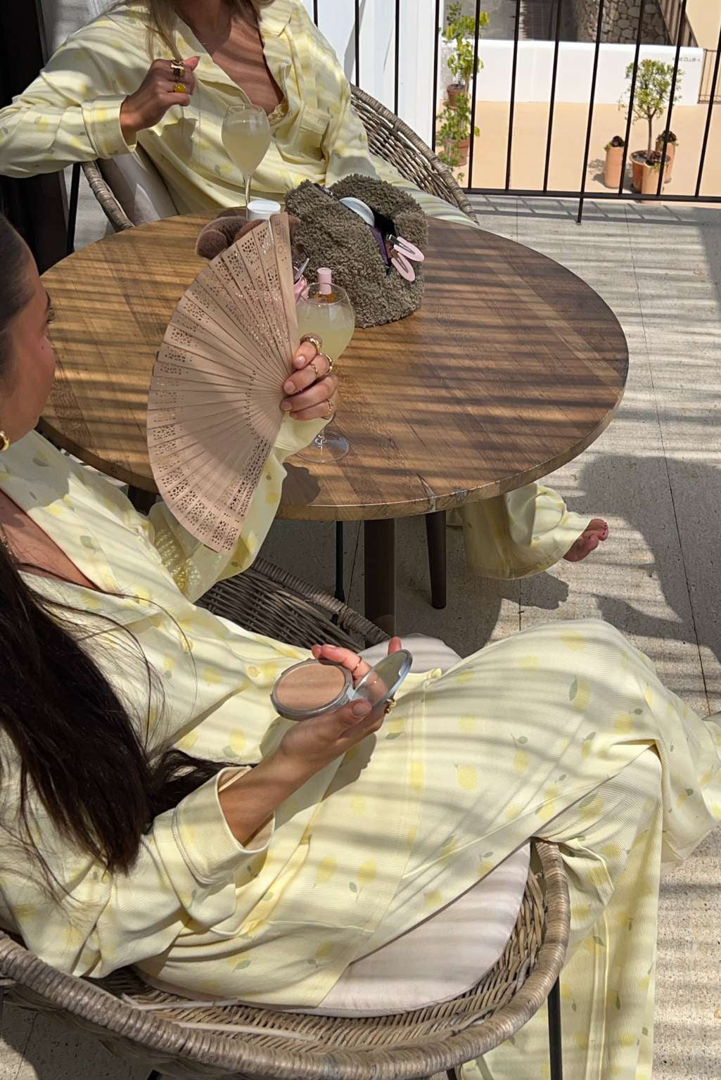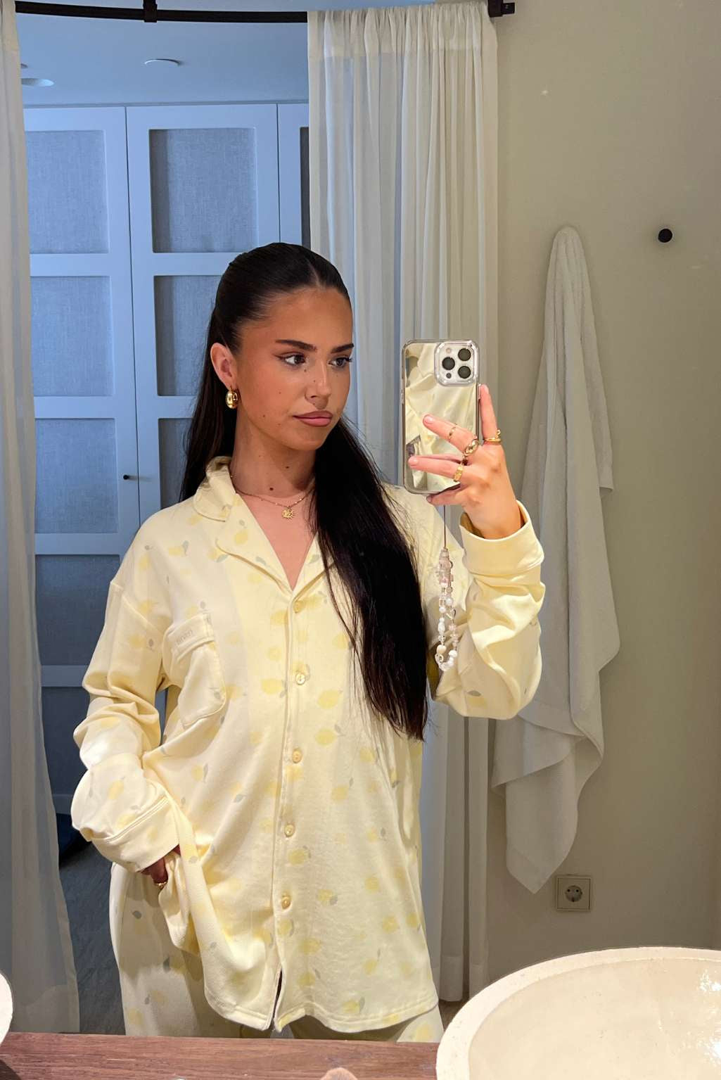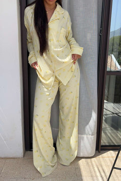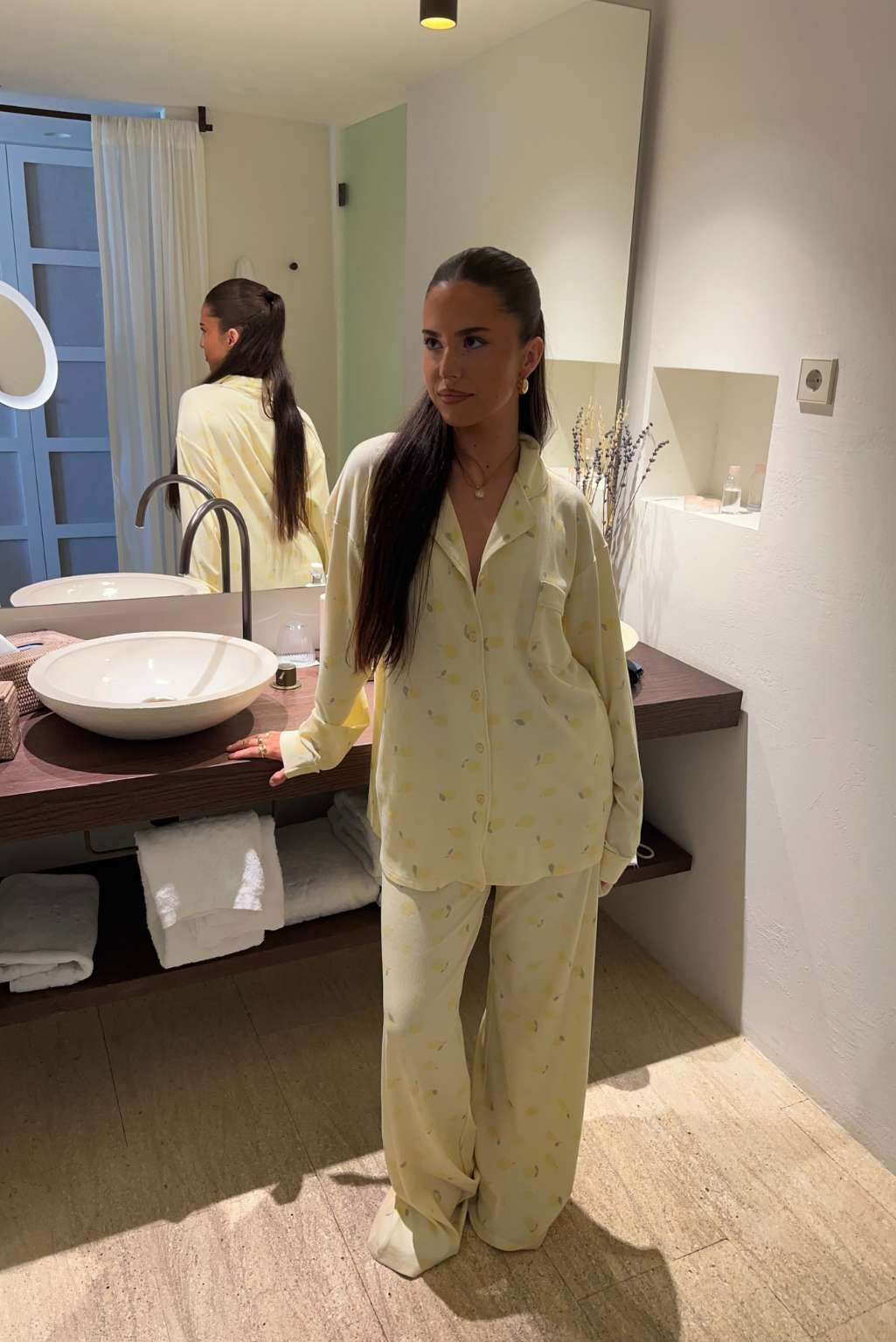 FITBERRY® CITRUS BLOOM PYJAMAS SHIRT. The softest butter yellow pyjamas shirts featuring a delicate all-over citrus lemon print, dropped shoulders, buttoned front, long sleeves, loose fit and FITBERRY® embroidered logo to chest. Crafted from a silky, breathable modal rib with an oversized fit and gentle stretch. This set is perfect for slow mornings and golden hour evenings.