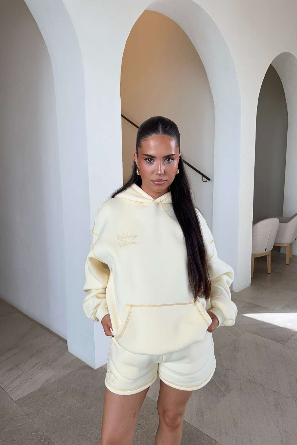 Model 2: Anne is 160cm and wears a size S in hoodie and size M in joggers / shorts.