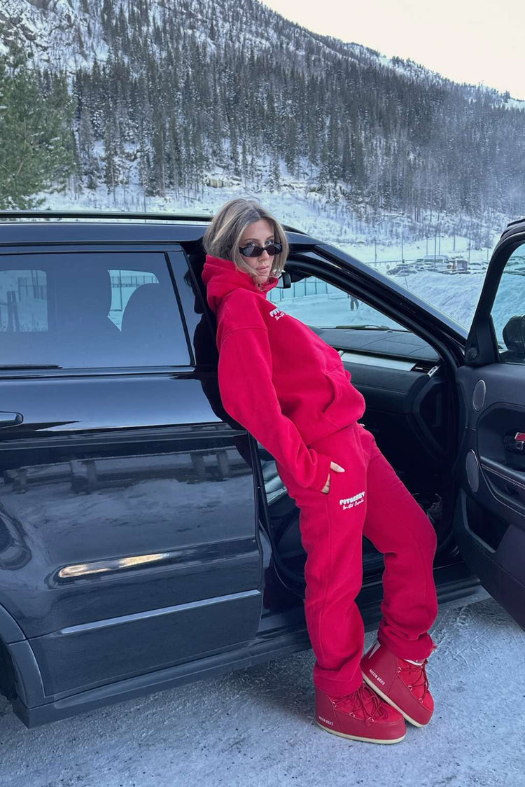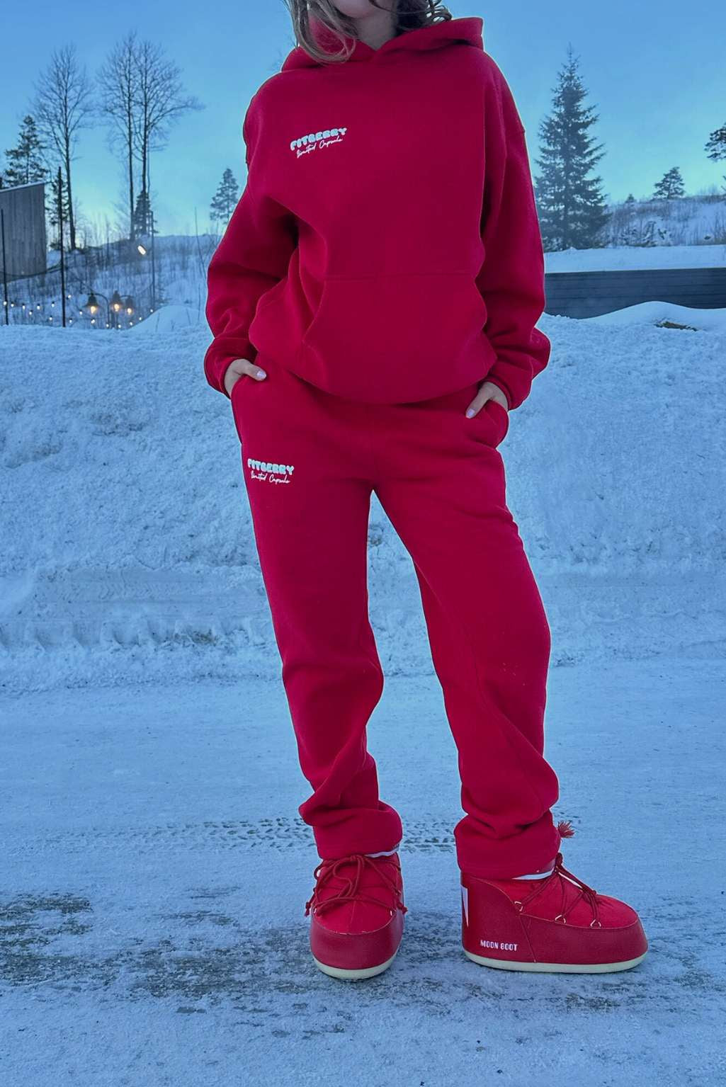 Julie Fiala is 185cm and wears a size L in both hoodie and joggers.