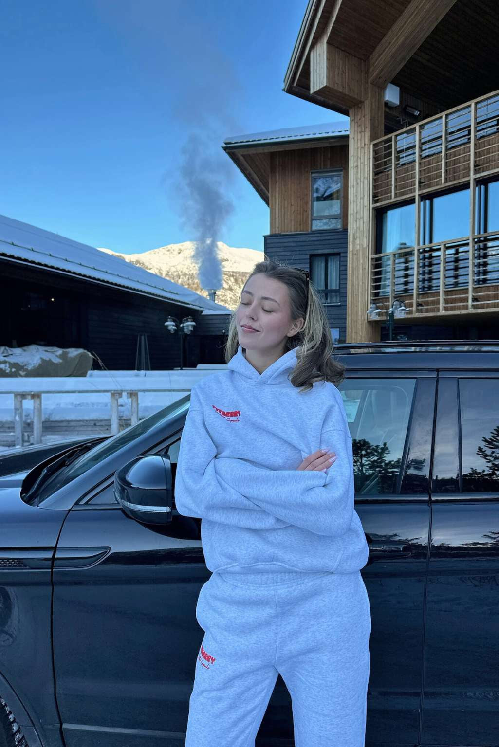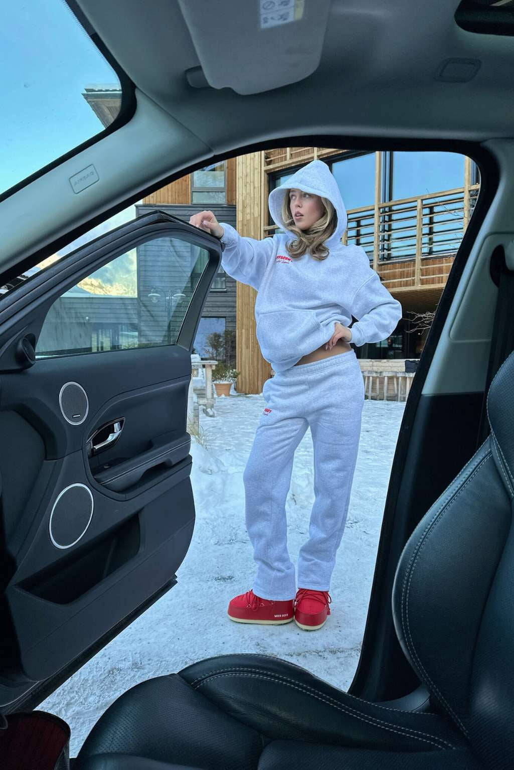 Julie Fiala is 185cm and wears a size L in both hoodie and joggers.