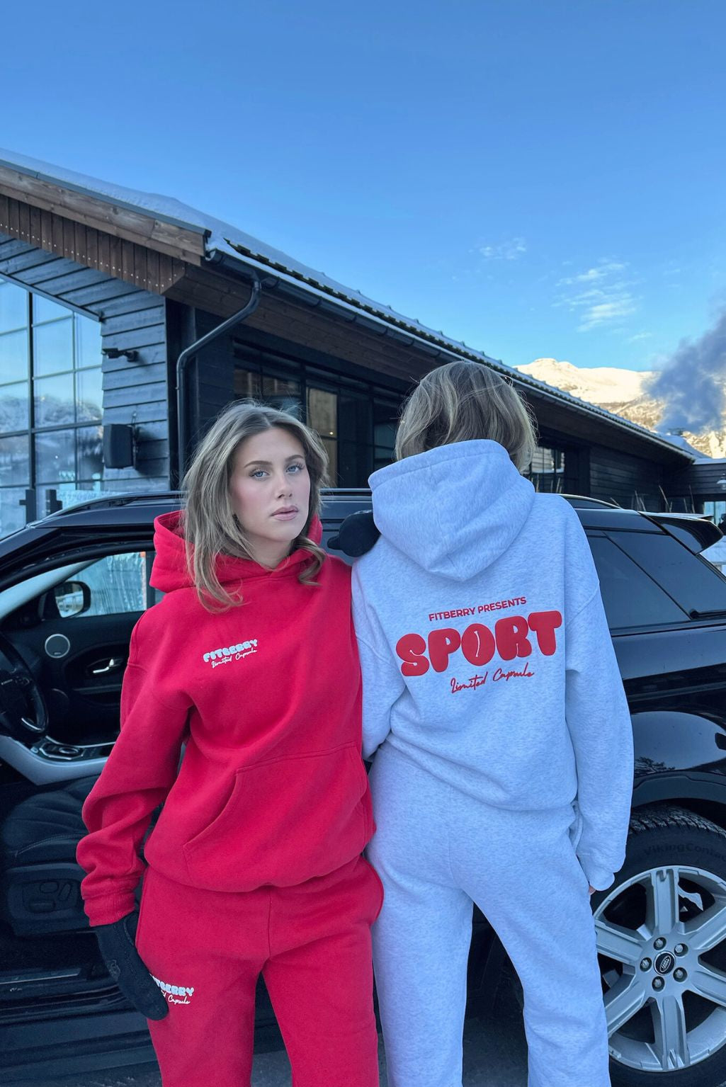 FITBERRY® SPORT OVERSIZED HOODIE. An oversized hoodie crafted from premium high-quality cotton fabric. The hoodie has a soft fleece interior, dropped shoulders, a cozy hood and ribbed details on the sleeves and waist. Featuring FITBERRY® SPORT print to front and back.