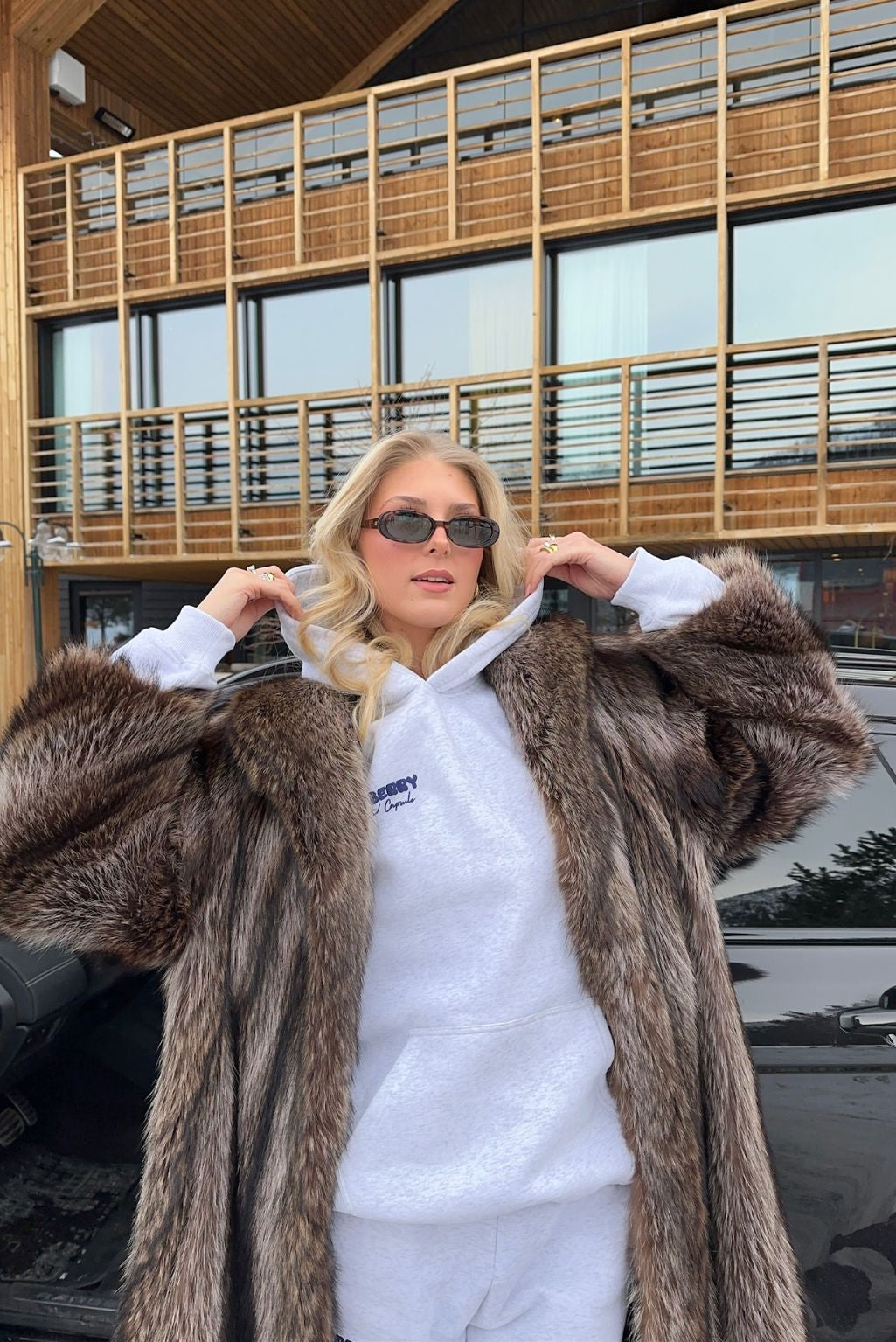FITBERRY® SPORT OVERSIZED HOODIE. An oversized hoodie crafted from premium high-quality cotton fabric. The hoodie has a soft fleece interior, dropped shoulders, a cozy hood and ribbed details on the sleeves and waist. Featuring FITBERRY® SPORT print to front and back.