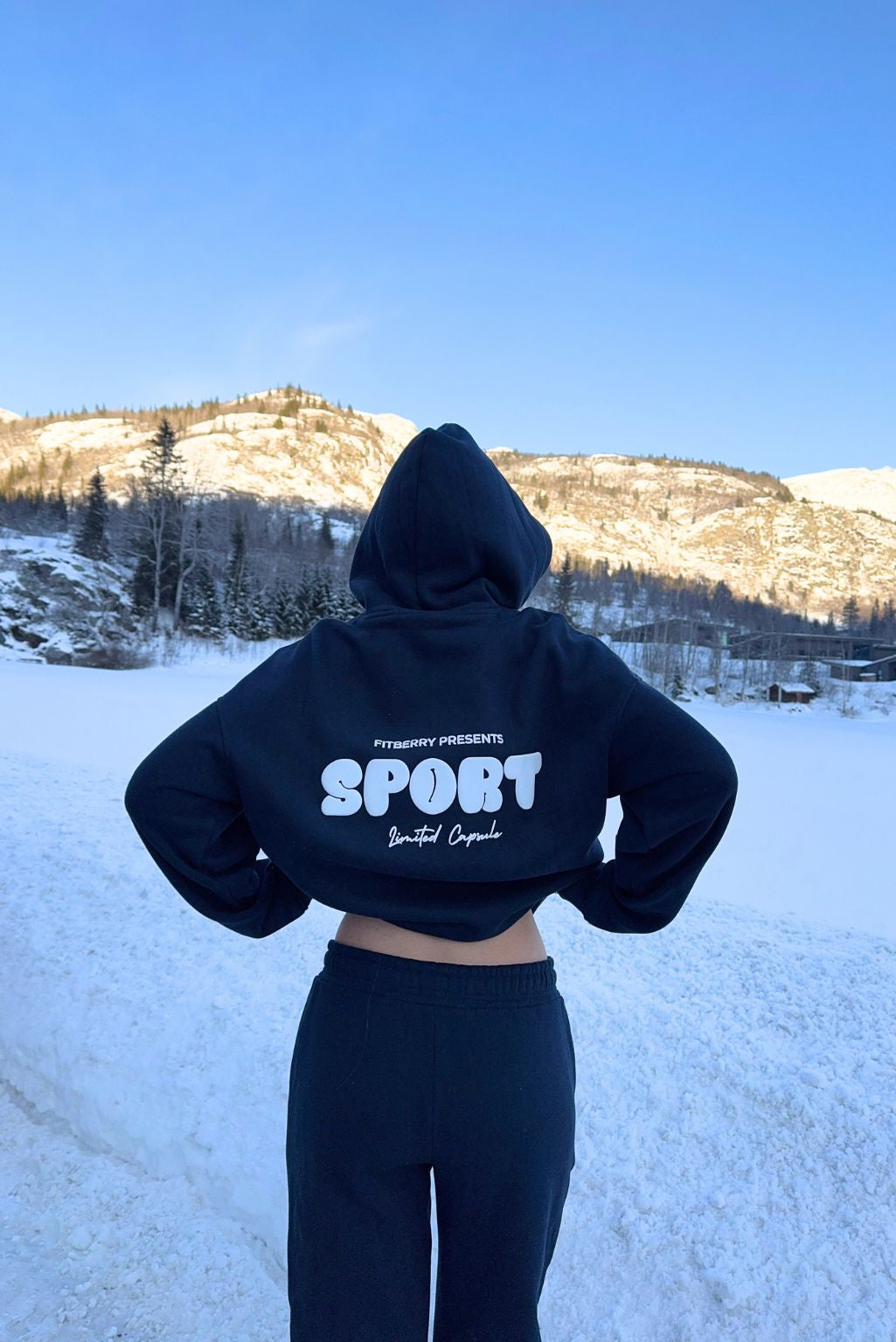 FITBERRY® SPORT OVERSIZED HOODIE. An oversized hoodie crafted from premium high-quality cotton fabric. The hoodie has a soft fleece interior, dropped shoulders, a cozy hood and ribbed details on the sleeves and waist. Featuring FITBERRY® SPORT print to front and back.