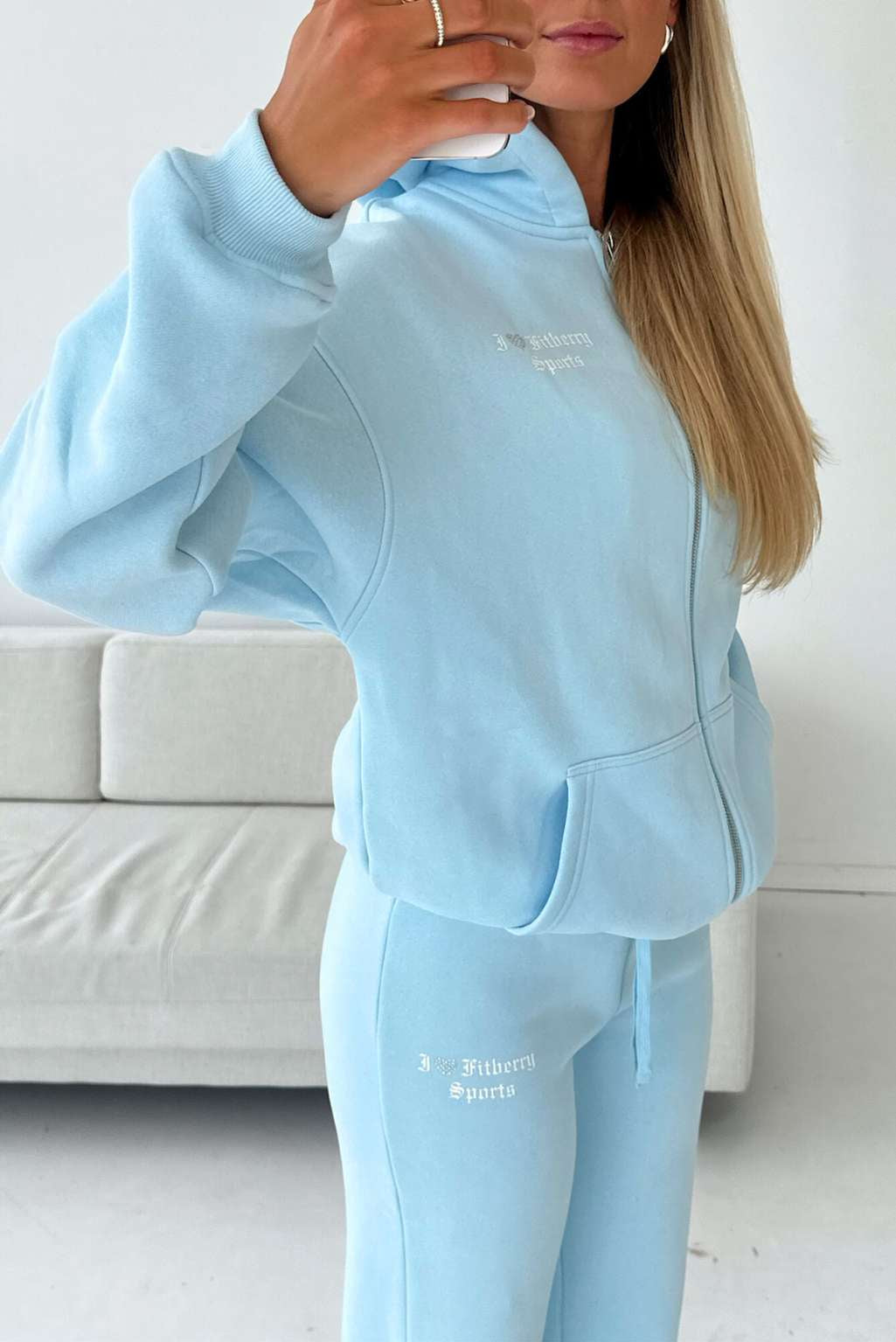 I ♥ FITBERRY® OVERSIZED ZIP HOODIE. An oversized hoodie crafted from premium high-quality cotton fabric. The hoodie has a zipper in front, soft fleece interior, dropped shoulders, side pockets, a cozy hood and ribbed details on the sleeves and waist. Featuring I ♥ FITBERRY print to front and back with handmade rhinestone heart.