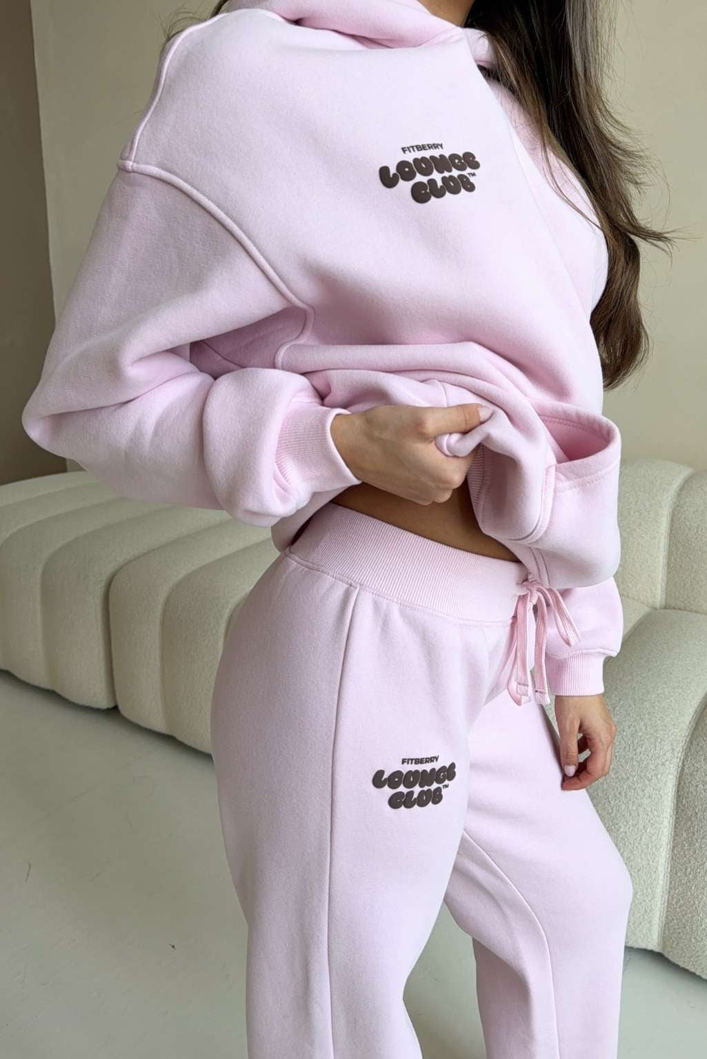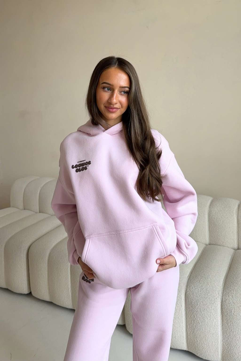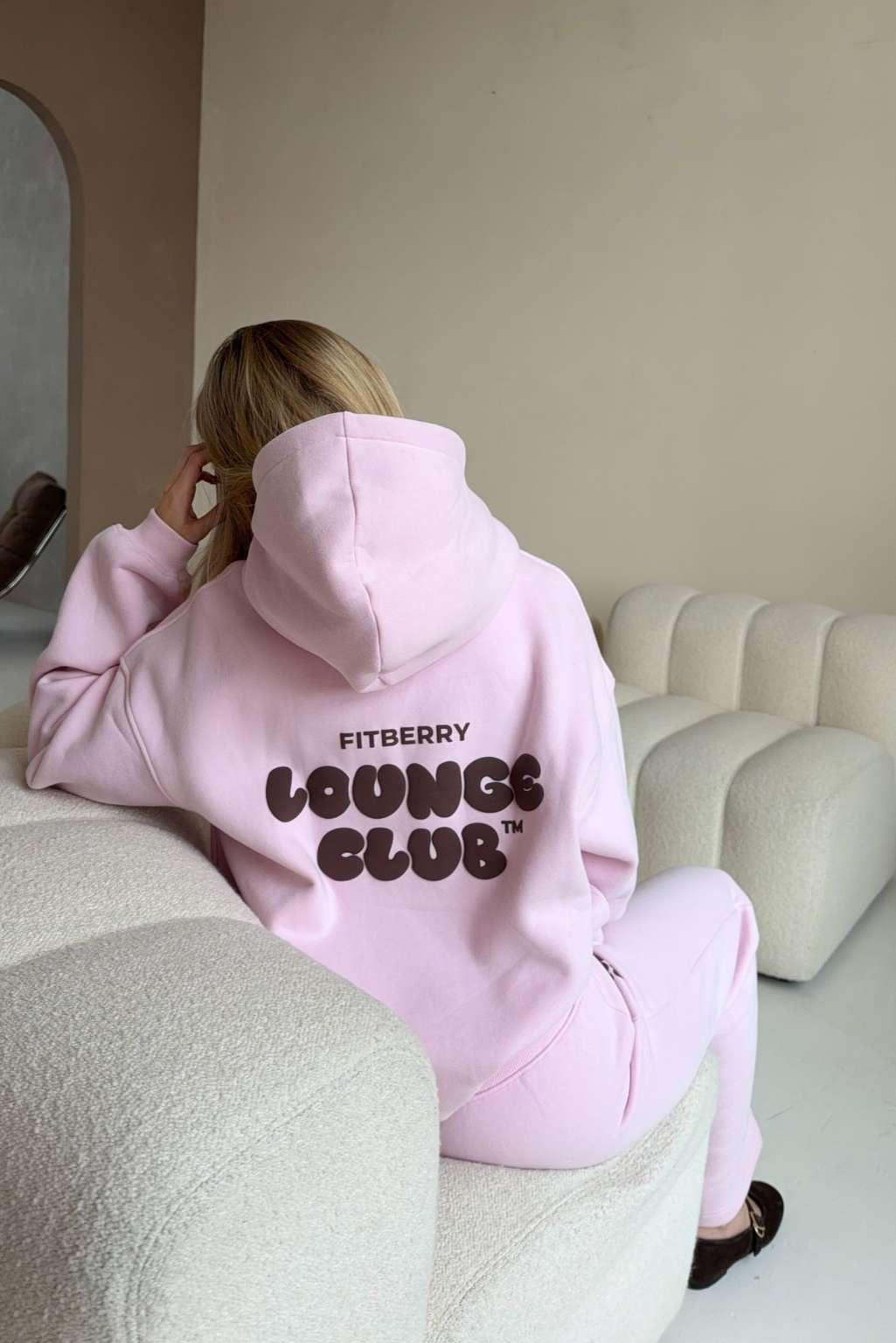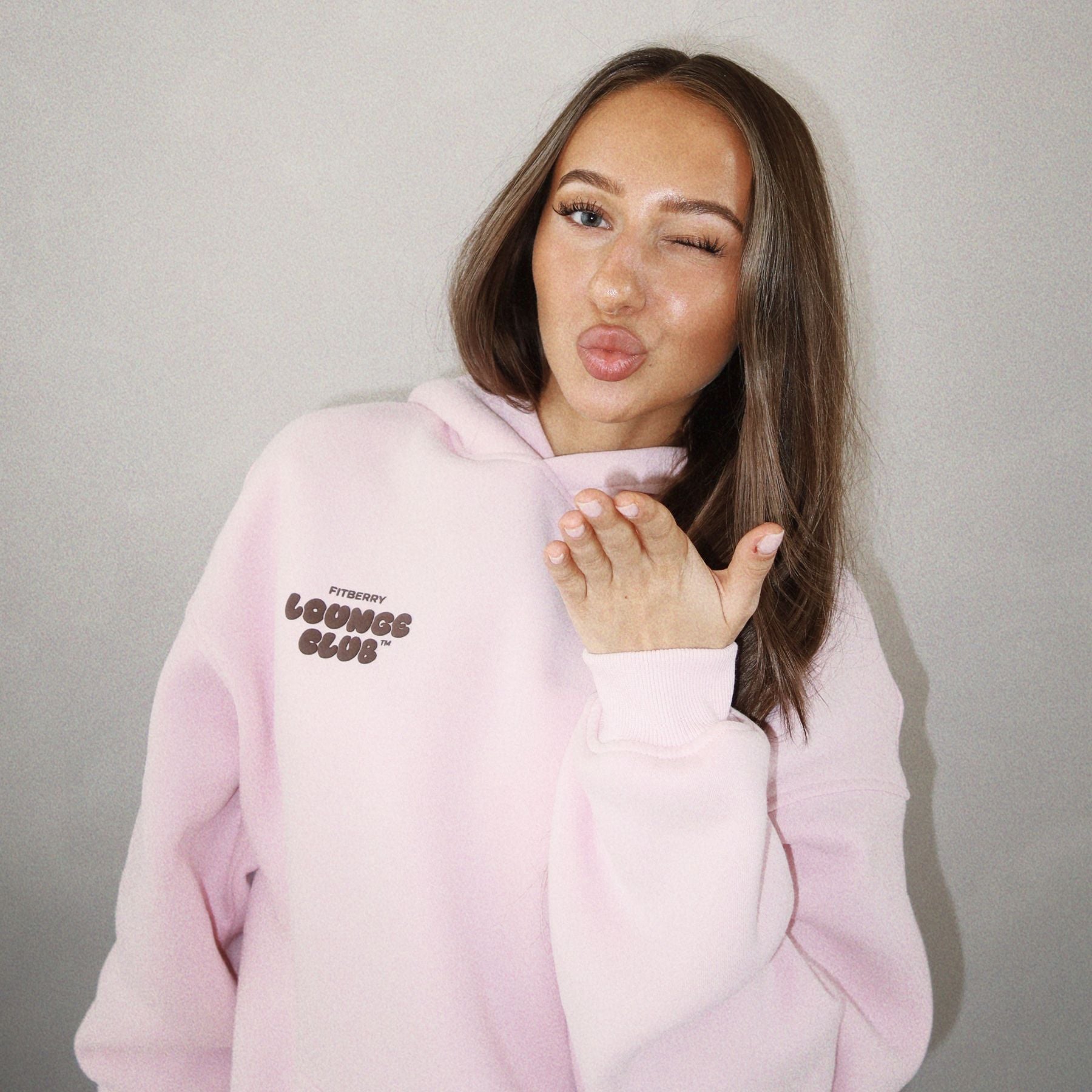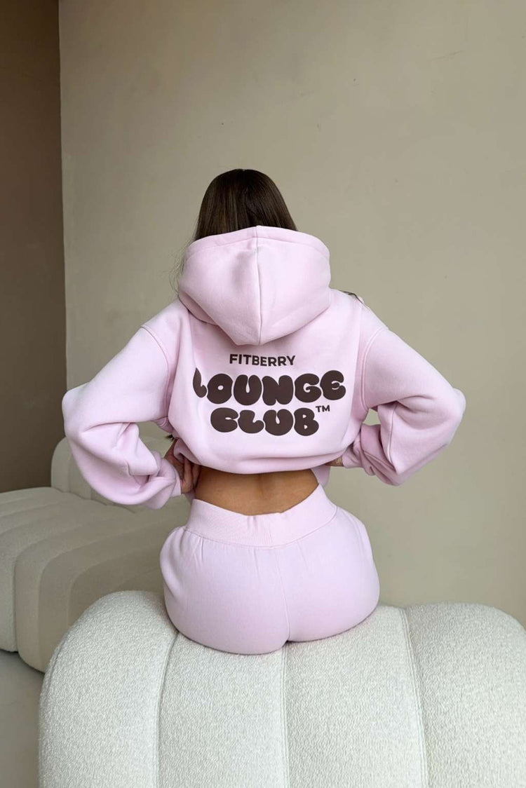 FITBERRY® LOUNGE CLUB OVERSIZED HOODIE. An oversized hoodie crafted from premium high-quality cotton fabric. The hoodie has a soft fleece interior, dropped shoulders, a cozy hood, front pocket and ribbed details on the sleeves and waist. Featuring our signature Fitberry Lounge Club print to front and back.