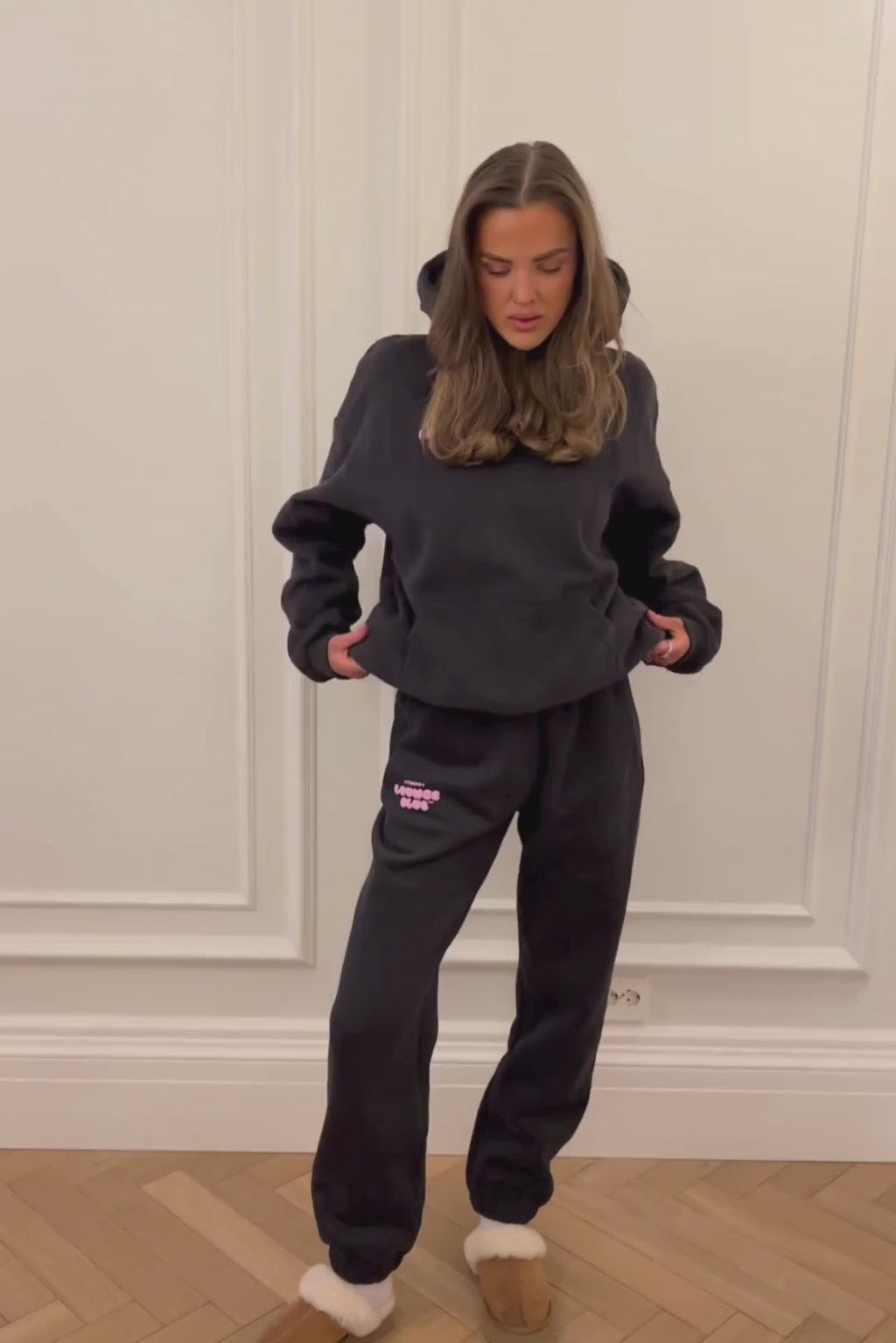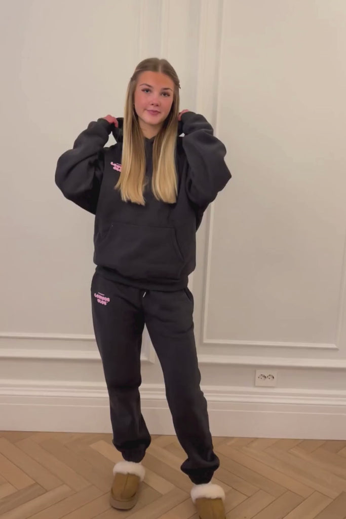 FITBERRY® LOUNGE CLUB OVERSIZED HOODIE. An oversized hoodie crafted from a premium high-quality cotton fabric. The hoodie has a soft fleece interior, dropped shoulders, a cozy hood and ribbed details on the sleeves and waist. Featuring our signature Fitberry Lounge Club print to front and back.
