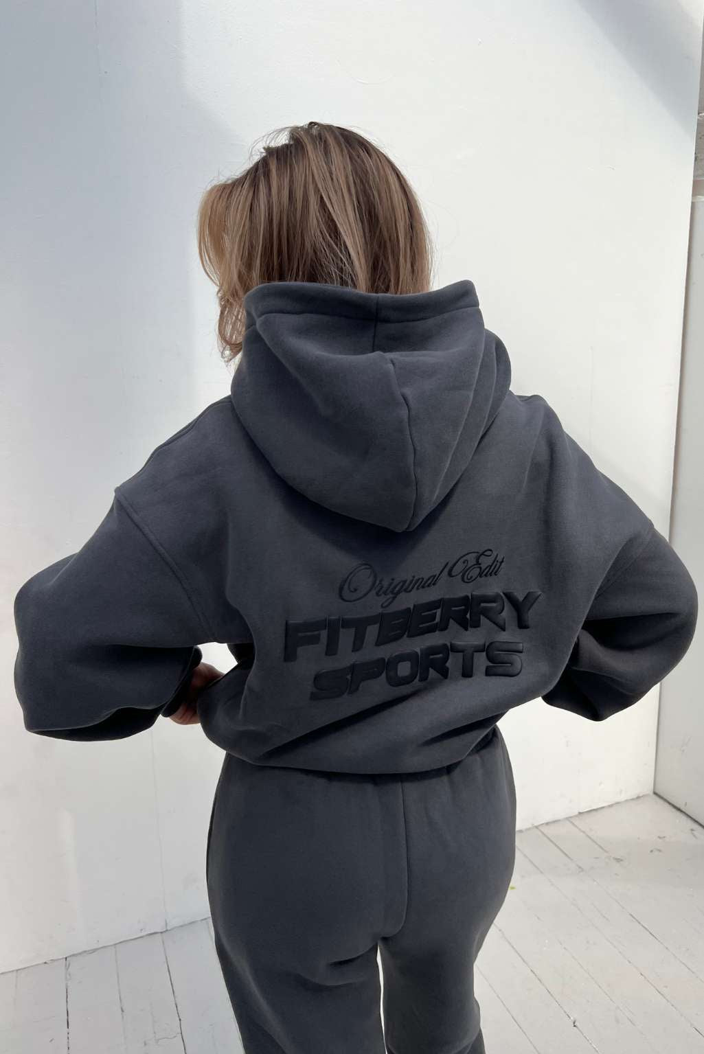 FITBERRY® ORIGINAL EDIT OVERSIZED HOODIE. An oversized hoodie crafted from premium high-quality cotton fabric. The hoodie has a soft fleece interior, dropped shoulders, a cozy hood and ribbed details on the sleeves and waist. Featuring Fitberry Original Edit print to front and back.