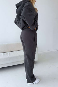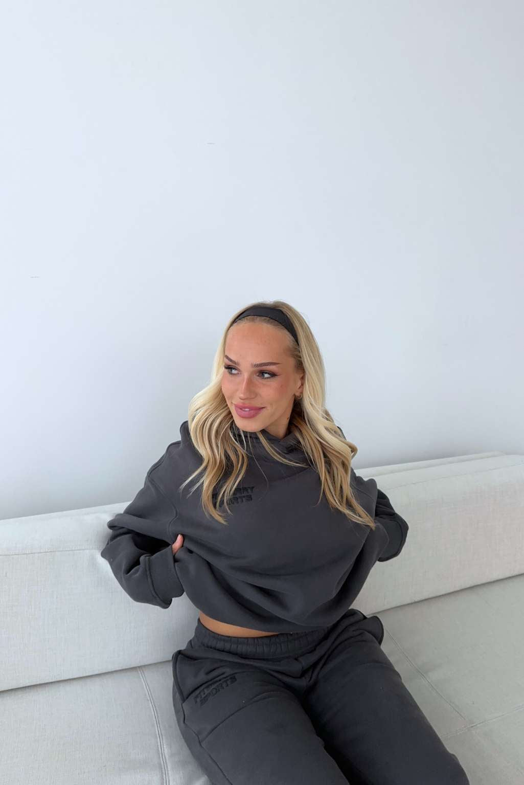 Model 3: Mia is 170cm and wears a size M in both hoodie and joggers.