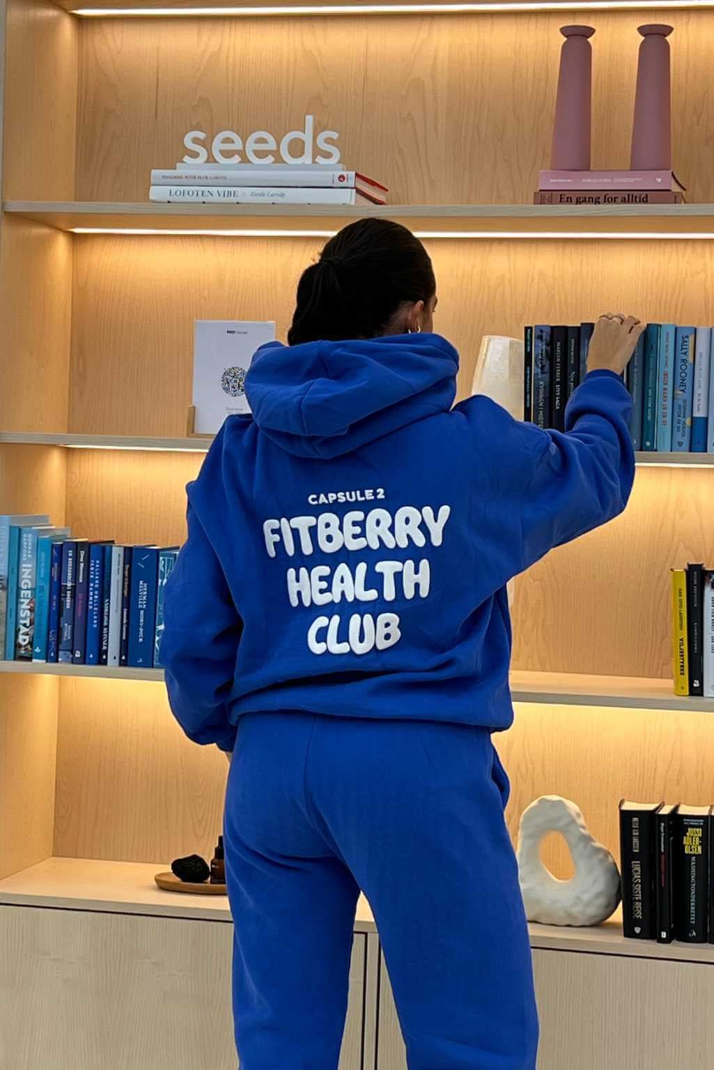 FITBERRY® HEALTH CLUB OVERSIZED HOODIE. An oversized hoodie crafted from a premium high-quality cotton fabric. The hoodie has a soft fleece interior, dropped shoulders, a cozy hood and ribbed details on the sleeves and waist. Featuring our signature Fitberry Health Club Capsule 2 logo to front and back.