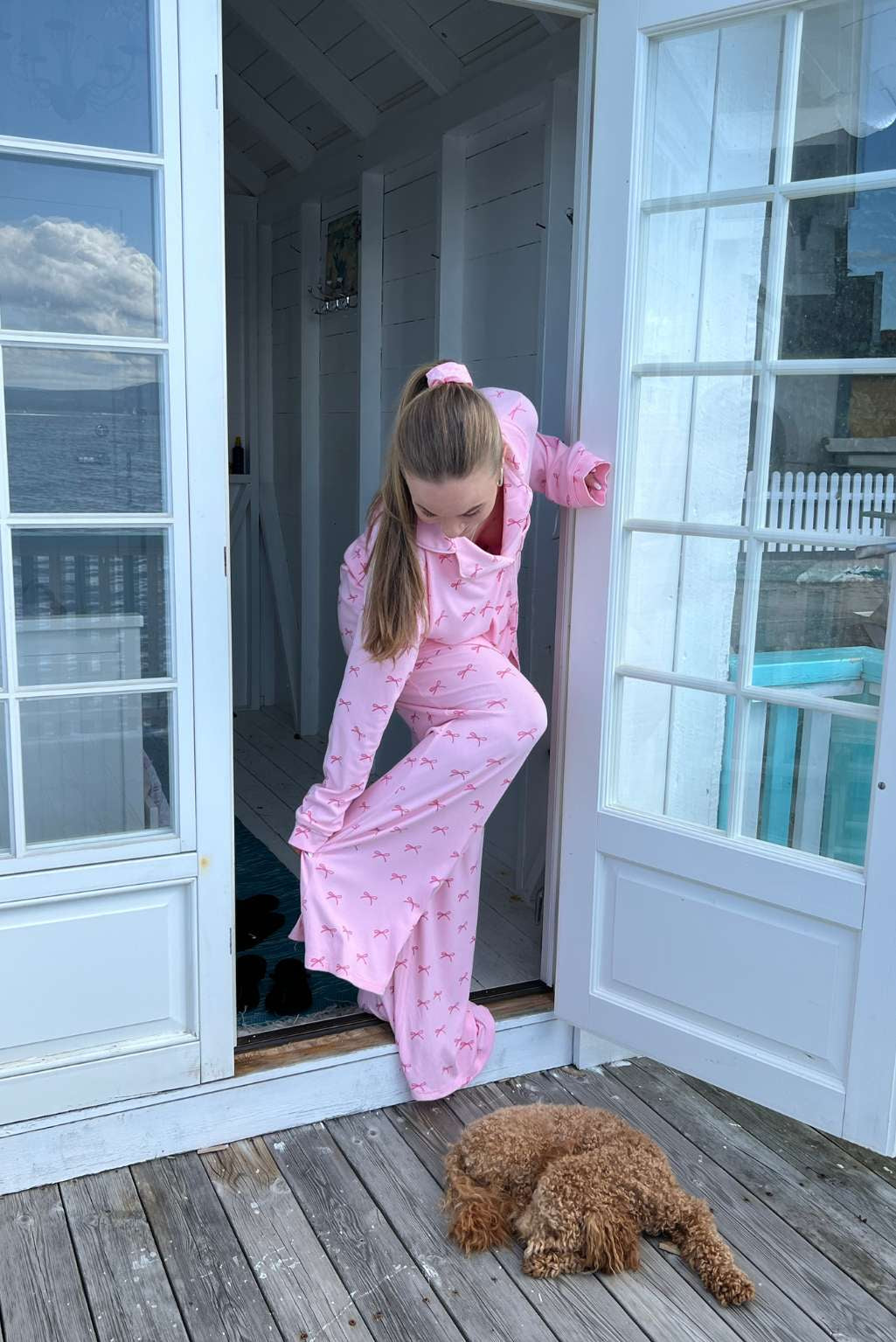 FITBERRY® RIBBON BLISS PYJAMAS PANTS. The softest pyjamas pants featuring ribbon print, wide leg, hidden elastic drawstring waist and deep pockets. Crafted from a ultra soft and stretchy modal rib fabric.