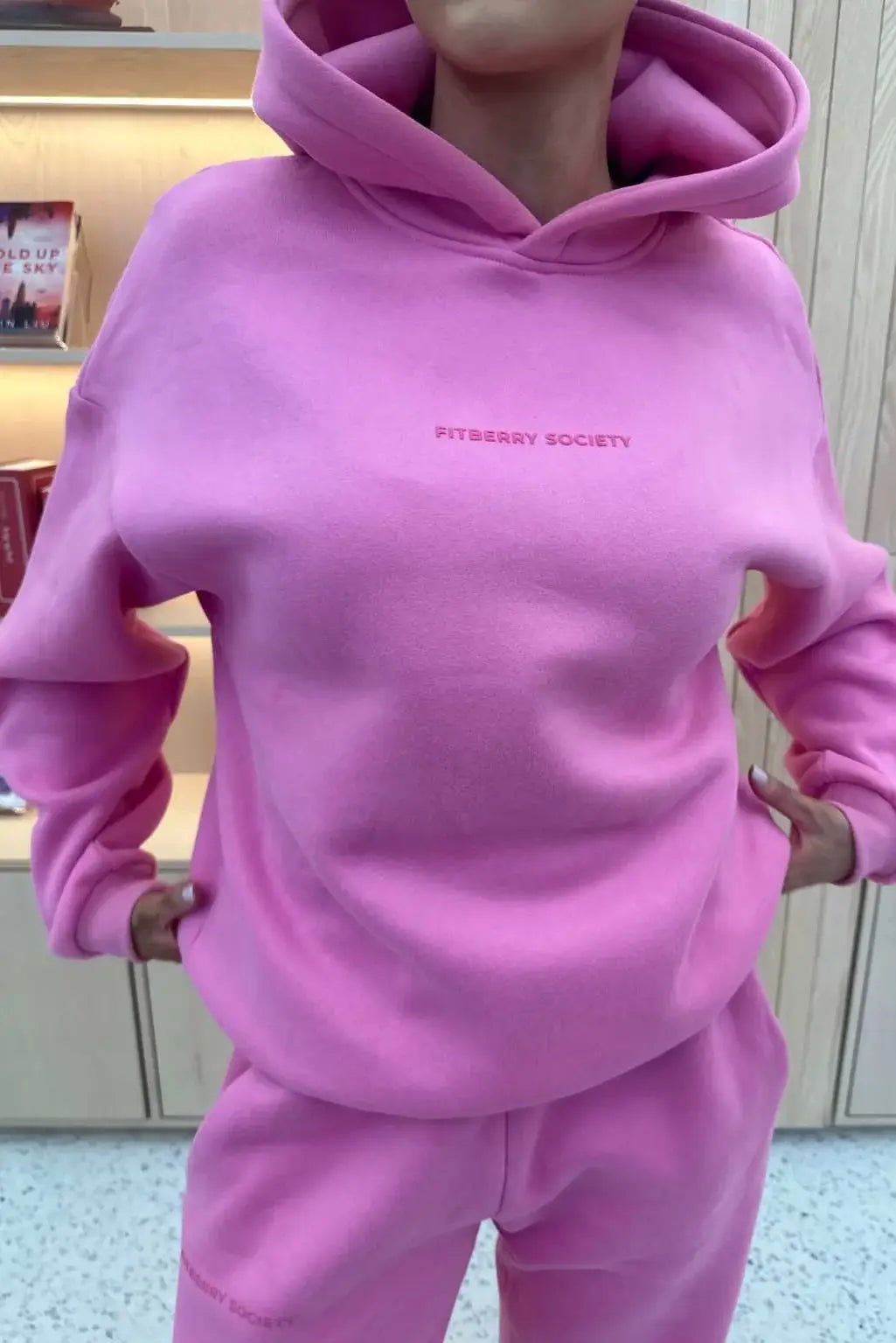 FITBERRY® SPORT SOCIETY OVERSIZED HOODIE. An oversized hoodie crafted from a premium high-quality cotton fabric. The hoodie has a soft fleece interior, dropped shoulders, a cozy hood and ribbed details on the sleeves and waist. Featuring our signature Sport Society print to front and back.