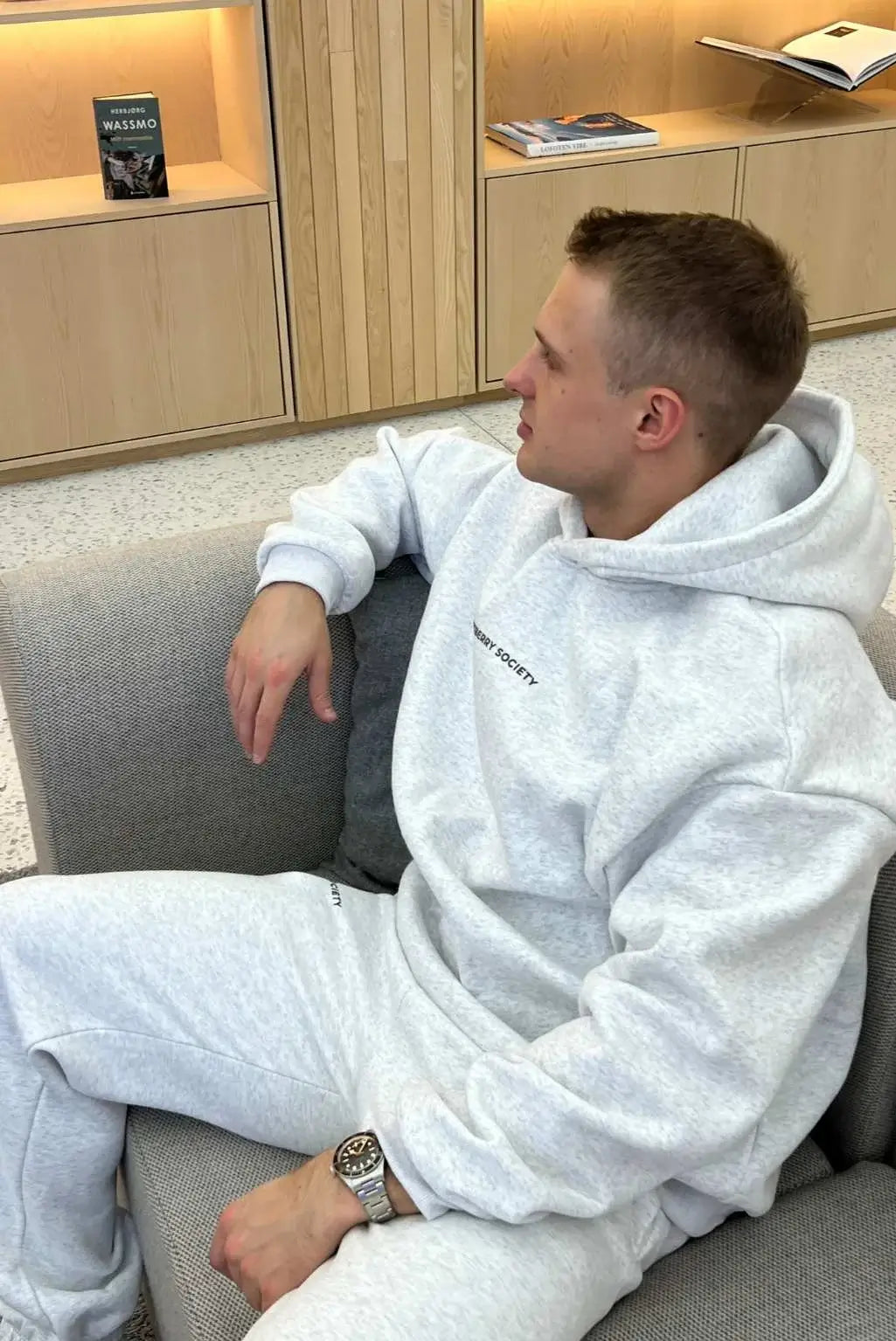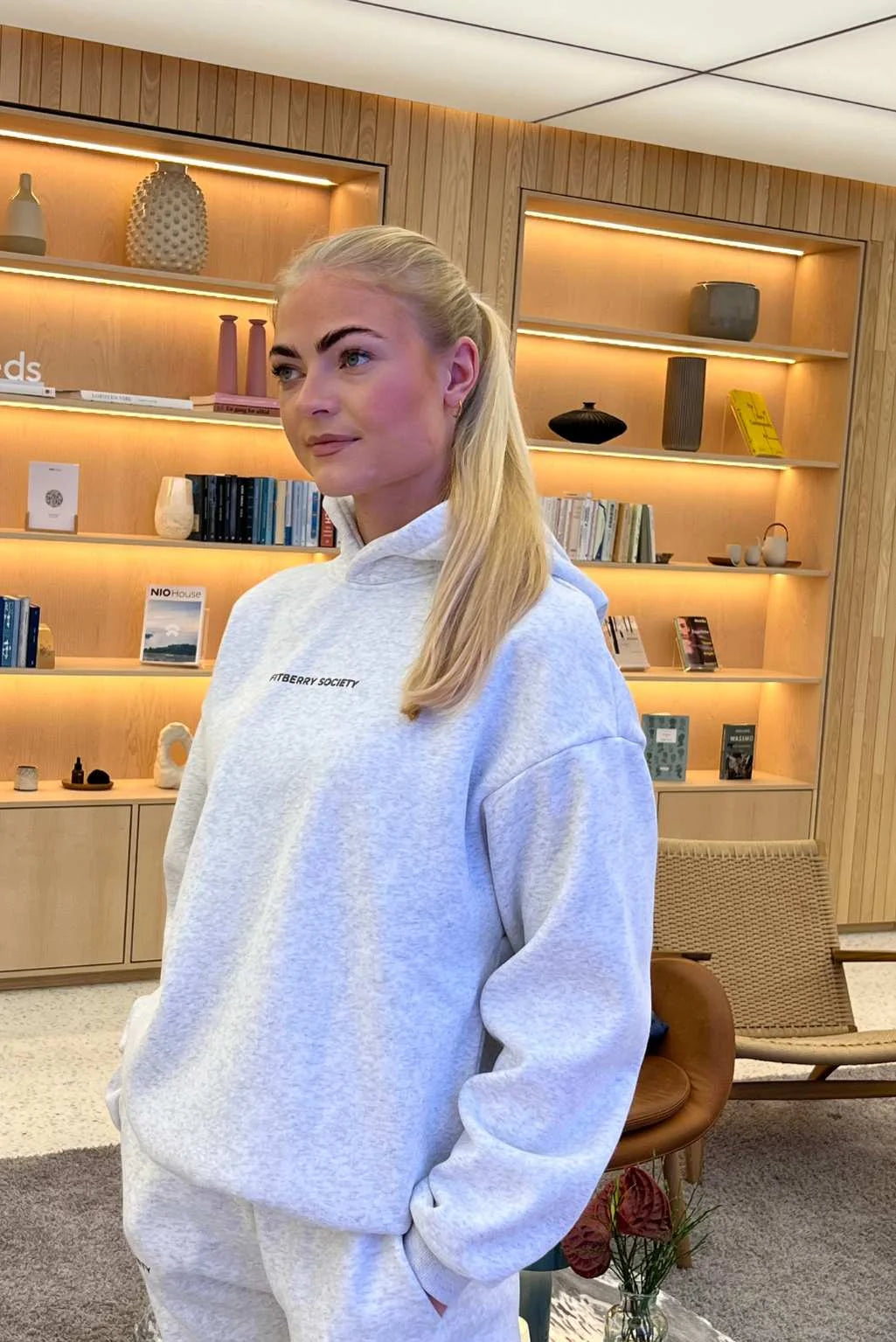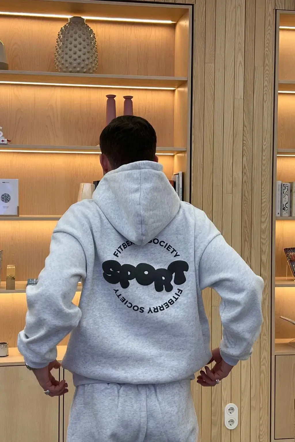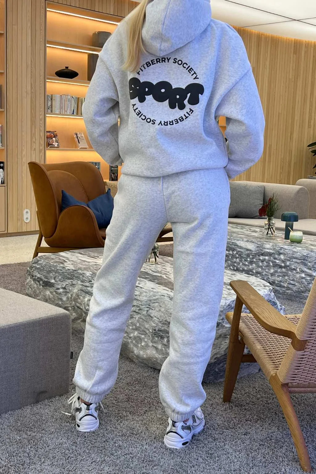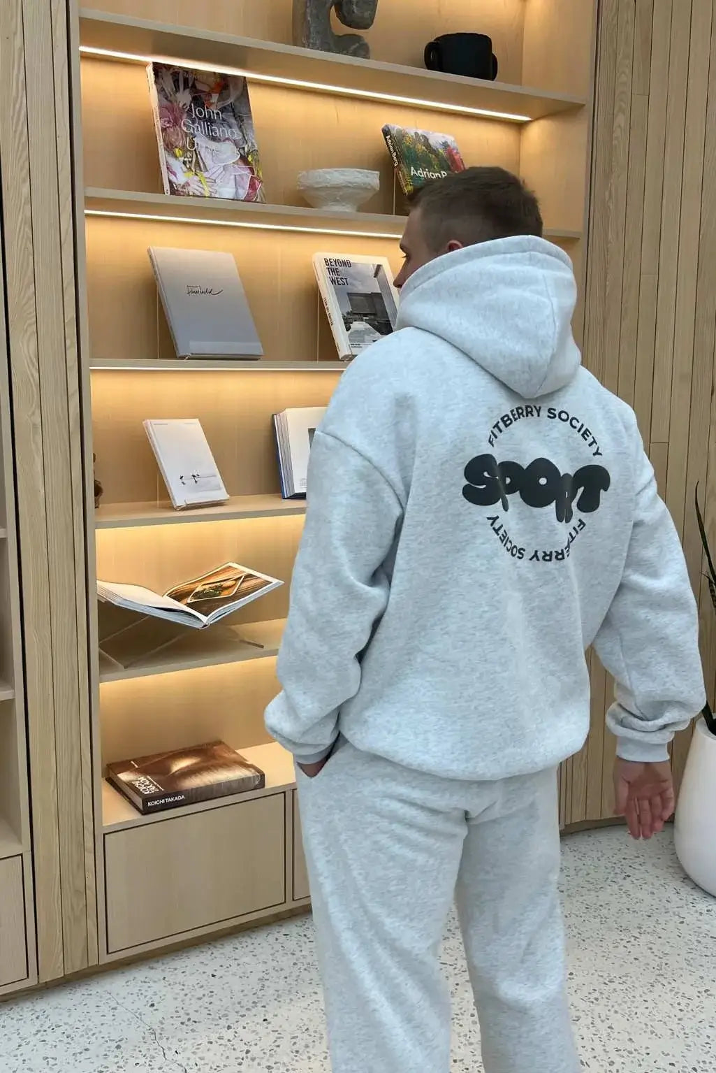FITBERRY® SPORT SOCIETY OVERSIZED HOODIE. An oversized hoodie crafted from a premium high-quality cotton fabric. The hoodie has a soft fleece interior, dropped shoulders, a cozy hood and ribbed details on the sleeves and waist. Featuring our signature Sport Society print to front and back.