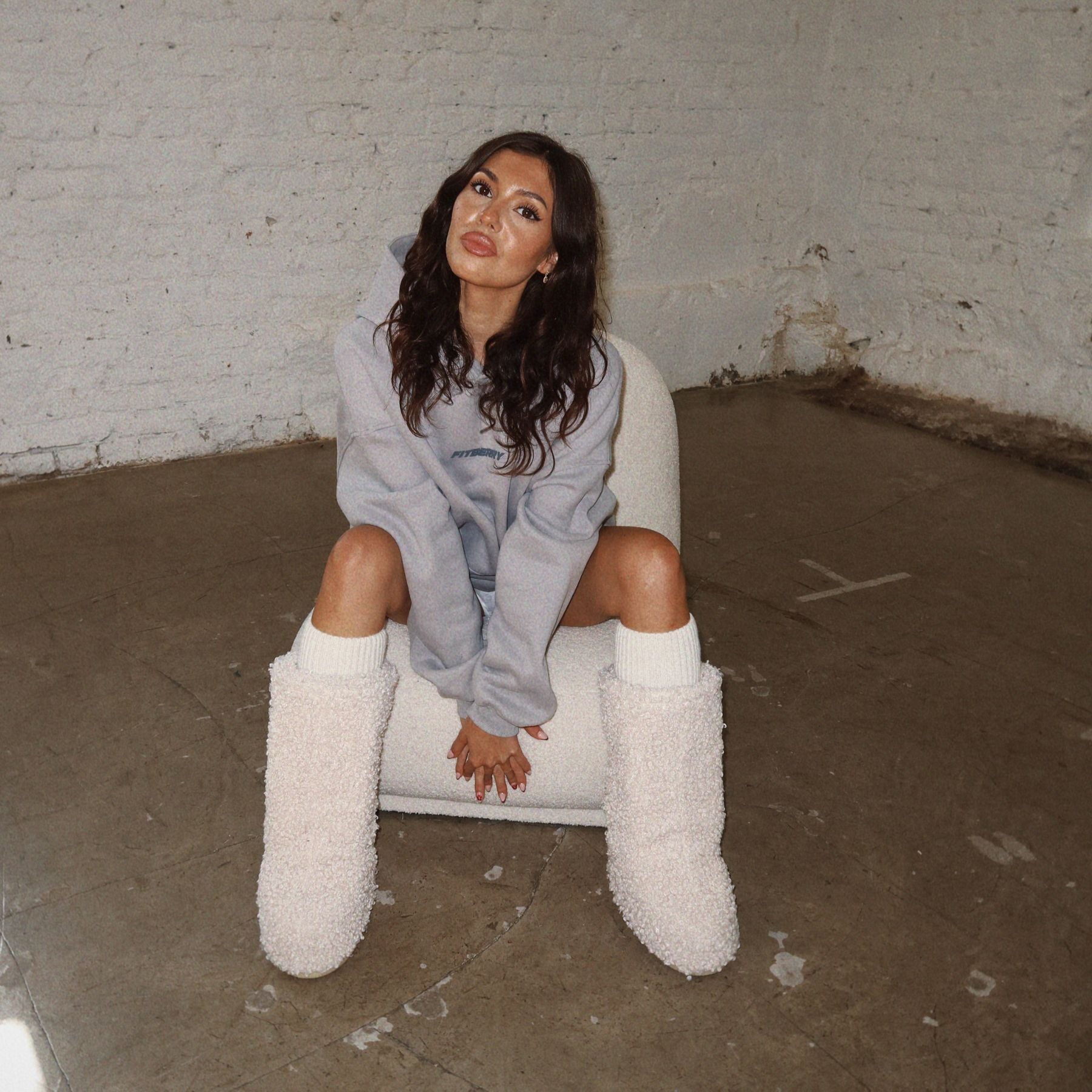FITBERRY® SPORTS CLUB OVERSIZED HOODIE. An oversized hoodie crafted from premium high-quality cotton fabric. The hoodie has a soft fleece interior, dropped shoulders, a cozy hood, front pocket and ribbed details on the sleeves and waist. Featuring Fitberry Sports Club print to front and back.