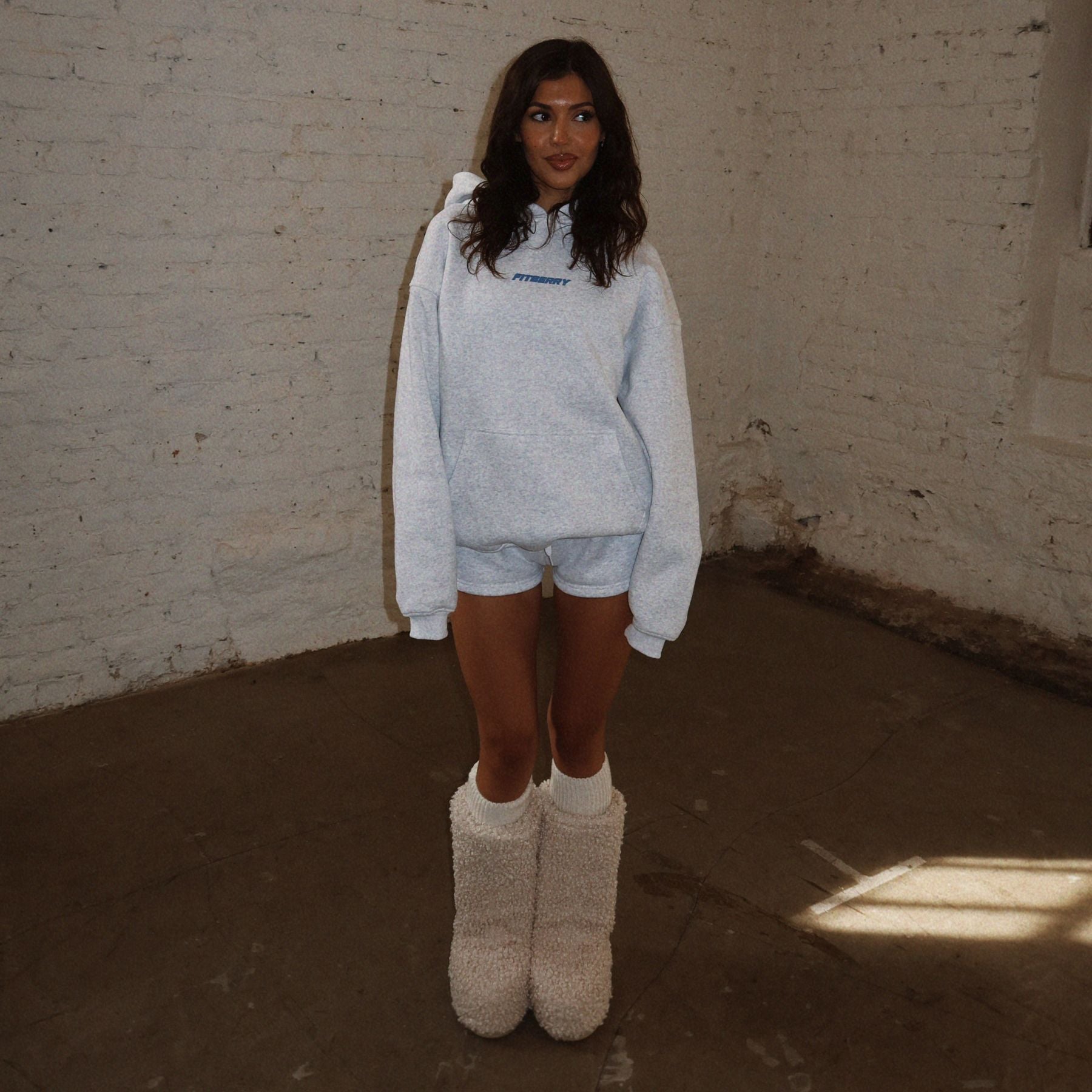 FITBERRY® SPORTS CLUB OVERSIZED HOODIE. An oversized hoodie crafted from premium high-quality cotton fabric. The hoodie has a soft fleece interior, dropped shoulders, a cozy hood, front pocket and ribbed details on the sleeves and waist. Featuring Fitberry Sports Club print to front and back.