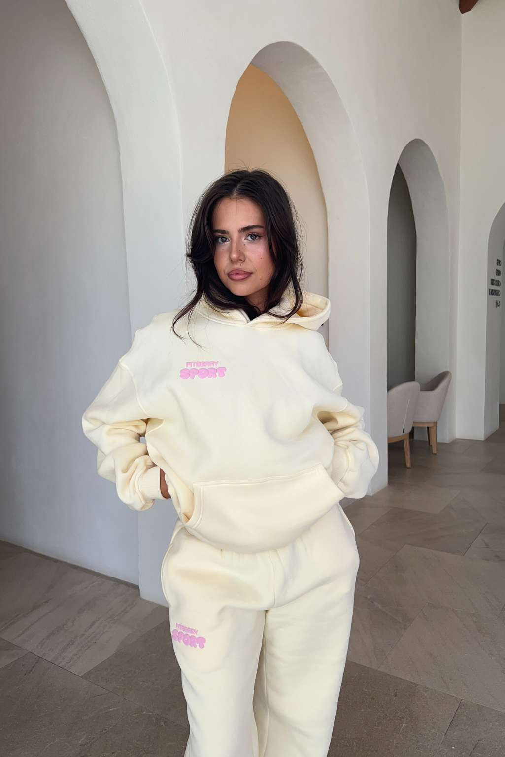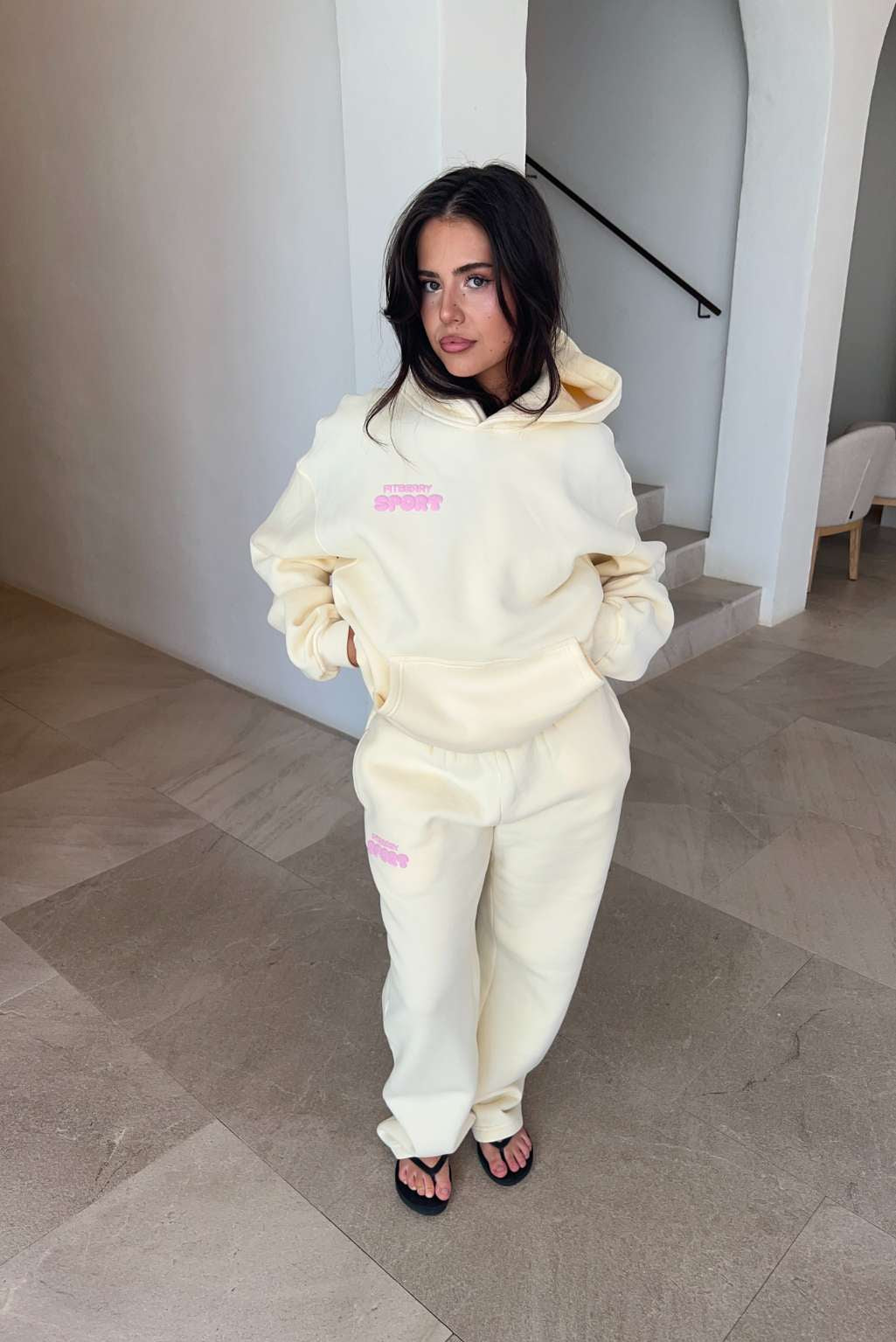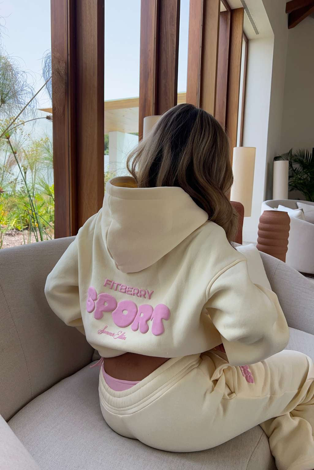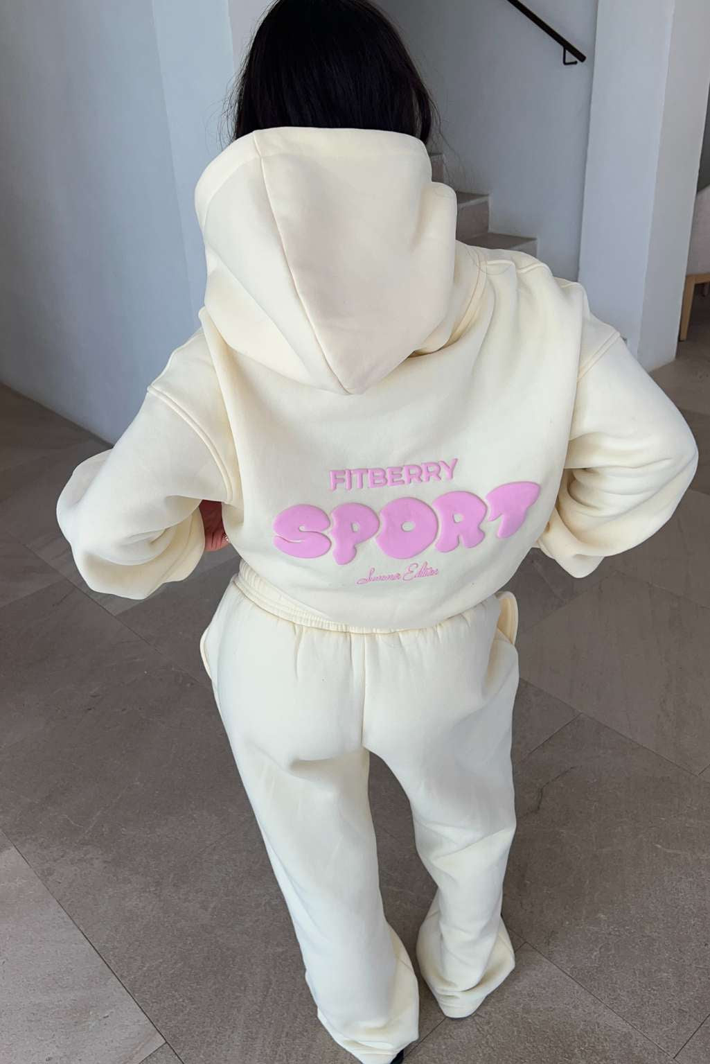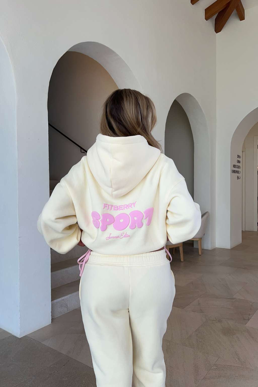 FITBERRY® SUMMER EDITION OVERSIZED HOODIE. An oversized hoodie crafted from premium high-quality cotton fabric. The hoodie has a soft fleece interior, dropped shoulders, a cozy hood, front pocket and ribbed details on the sleeves and waist. Featuring Fitberry Summer Edition print to front and back.
