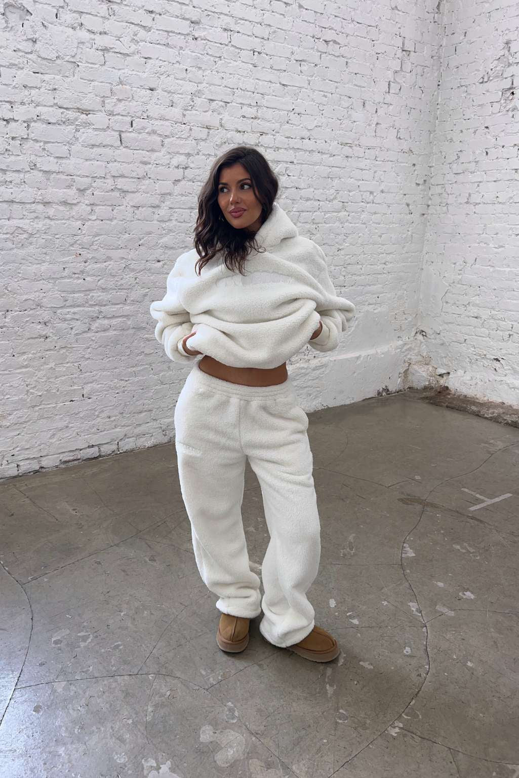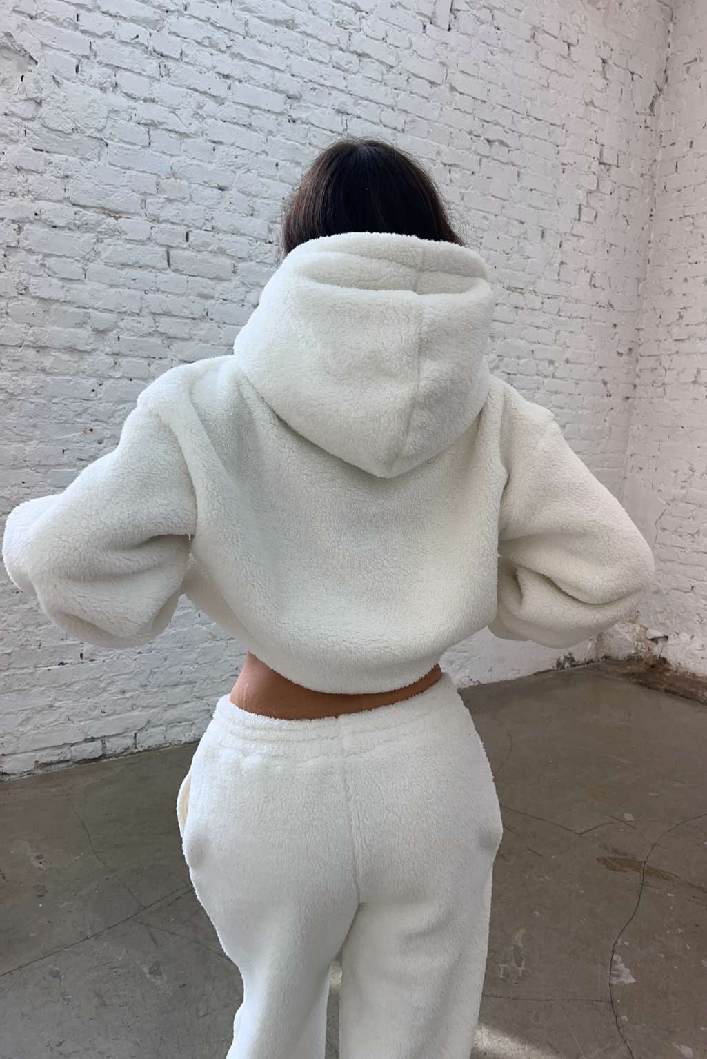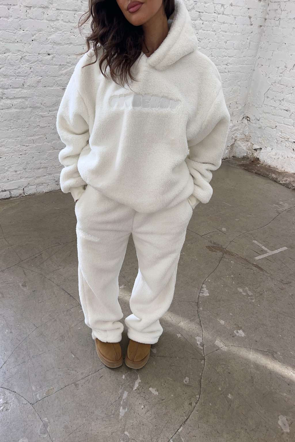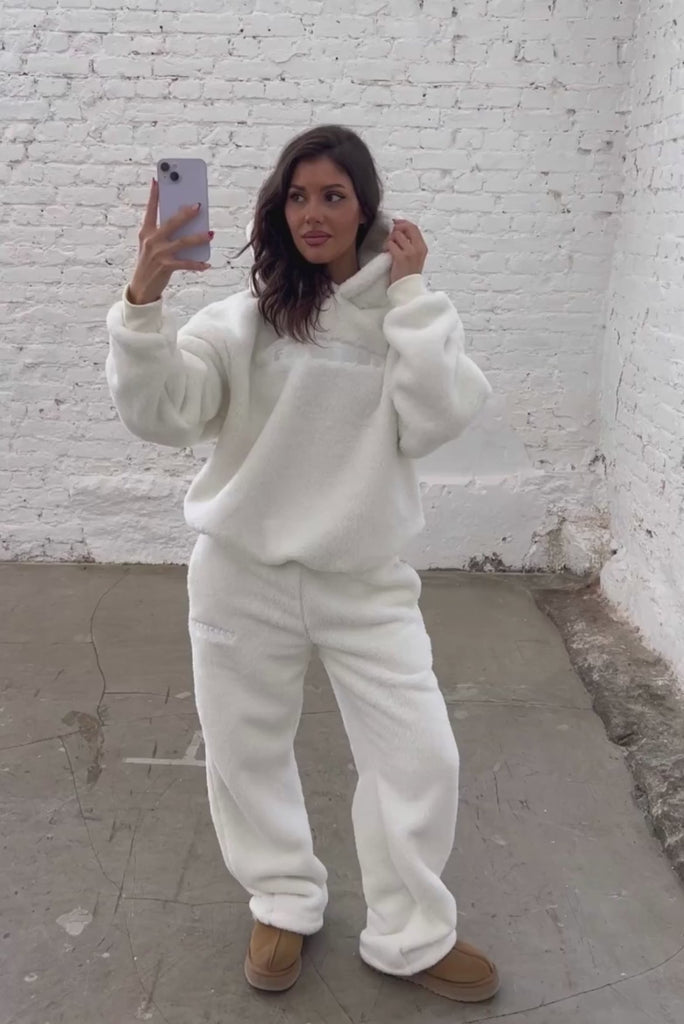 FITBERRY® SNOW BUNNY OVERSIZED HOODIE. An oversized hoodie crafted from a buttery soft teddy fleece fabric. The hoodie has a soft fleece interior, dropped shoulders, a big cozy hood and Fitberry embroidery logo to front.