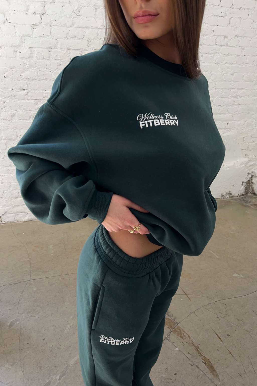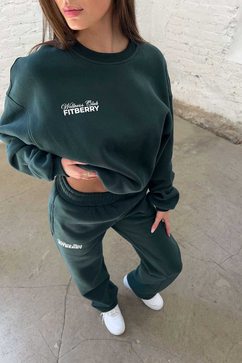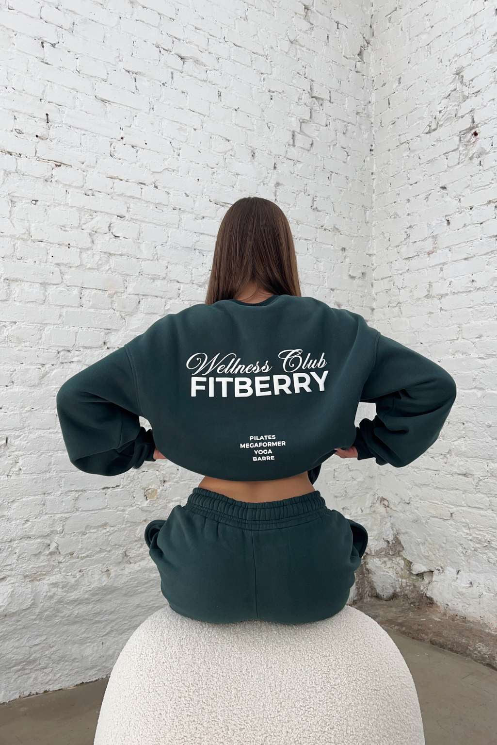 FITBERRY® WELLNESS CLUB OVERSIZED CREWNECK. An oversized crewneck crafted from premium high-quality cotton fabric. The crewneck has a soft fleece interior, round neck, dropped shoulders and ribbed details at the neck, cuffs and waist. Featuring FITBERRY® WELLNESS CLUB print to front and back.