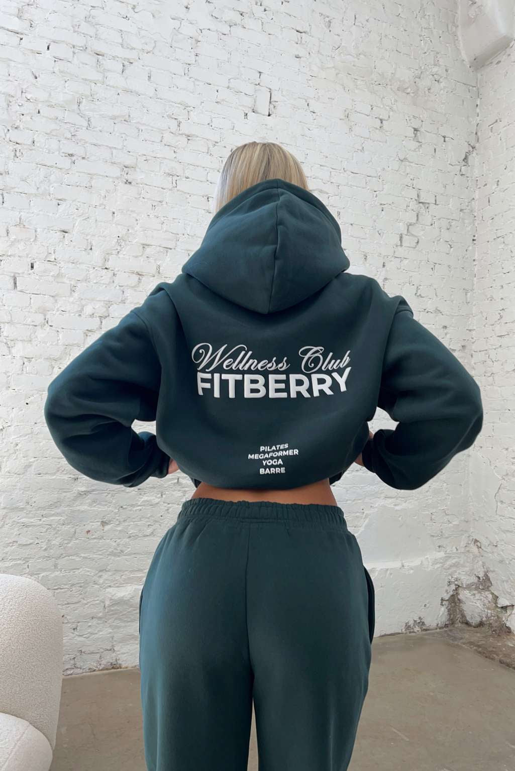 FITBERRY® WELLNESS CLUB OVERSIZED HOODIE. An oversized hoodie crafted from premium high-quality cotton fabric. The hoodie has a soft fleece interior, dropped shoulders, a cozy hood and ribbed details on the sleeves and waist. Featuring FITBERRY® WELLNESS CLUB print to front and back.