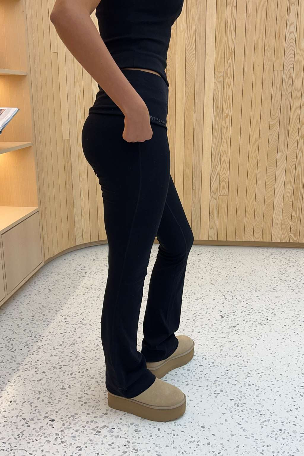 FITBERRY® YOGA PANTS. Soft and sculpting mid-waist yoga pants. Crafted from a breathable high-quality cotton fabric with added stretch. Designed with a slightly flared leg, subtle stretch and a folded waistband. Featuring a minimalist tonal FITBERRY® logo detail to front.